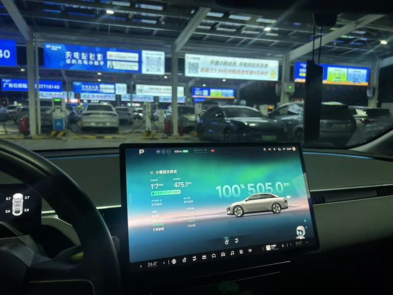 采购完毕,返程前先去小鹏超充站补能。大屏上实时显示附近超充站的空闲桩位,抵达后无需下车,扫码、插枪一气呵成,超充技术让电量以肉眼可见的速度攀升。等待的间隙,坐在车内刷着冬至菜谱,1小时7分钟后,大屏弹出“充电完成”的提示,续航里程跳至505km,订单金额更是惊喜的0元(会员权益抵扣)。冬日里的补能焦虑,被小鹏的超充网络与贴心权益彻底消解,满电出发的瞬间,连归途的风都变得轻快。
