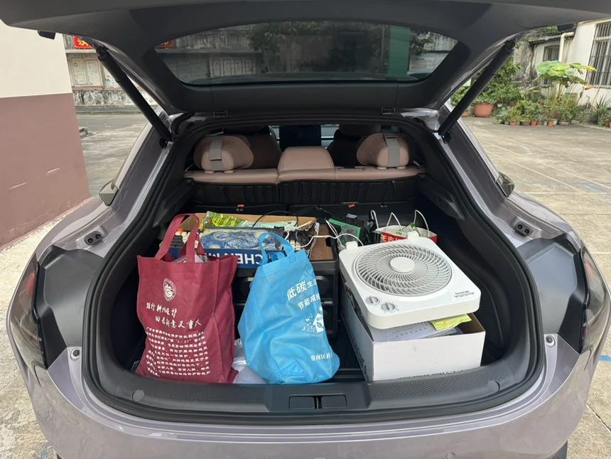 打开后备箱的那一刻,就知道选对车了。风扇、收纳箱、各种过冬的零碎物件,还有印着暖心标语的布袋,一股脑全塞进去都绰绰有余。