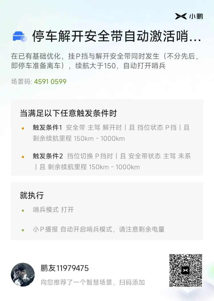 +++之前看到有位鹏友分享了一个停车之后解开安全带,自动激活哨兵模式的智慧场景(致谢工程师小智,场景码3608 0235),真的太喜欢了💋。但是发现如果在等待自动泊入的过程中提前解开了安全带,就无法触发🤔。于是我在鹏友的基础上进一步自定义,在已有基础优化了一下条件触发顺序,挂P挡与解开安全带都满足(泊入完成停车和解开安全带不分先后),续航大于150,自动打开哨兵🚔。(不用手动去点启用哨兵模式,下车直接从容离开,我的油车朋友们都羡慕极了,YYDS💋)