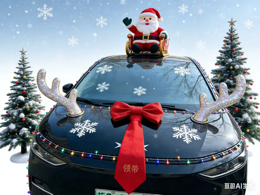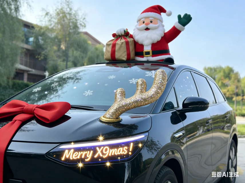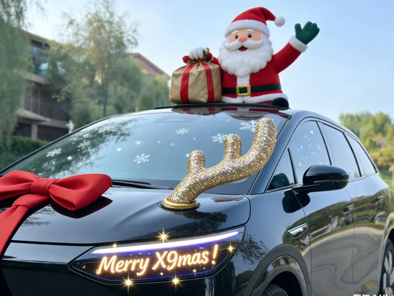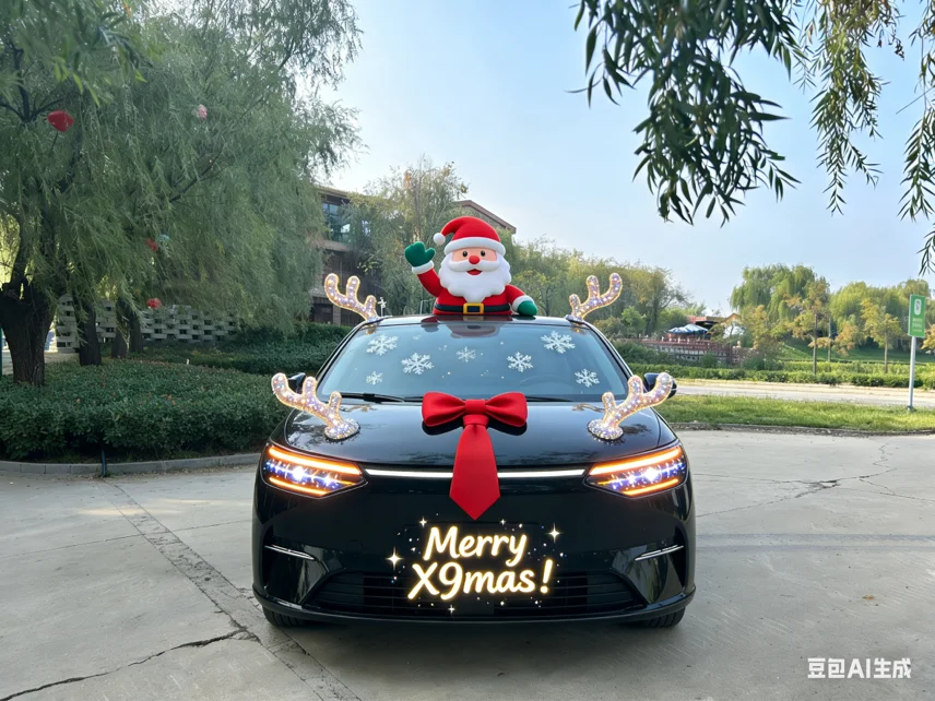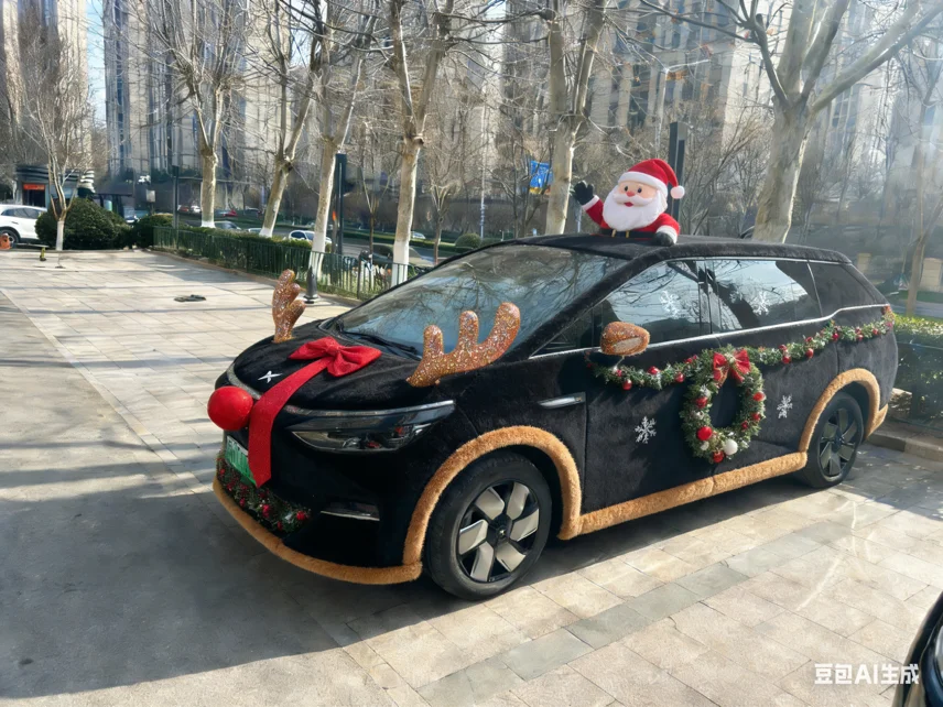这个圣诞,我的小鹏X9化身驯鹿座驾!车顶还坐着招手微笑的圣诞老人,雪花贴纸在车窗起舞。