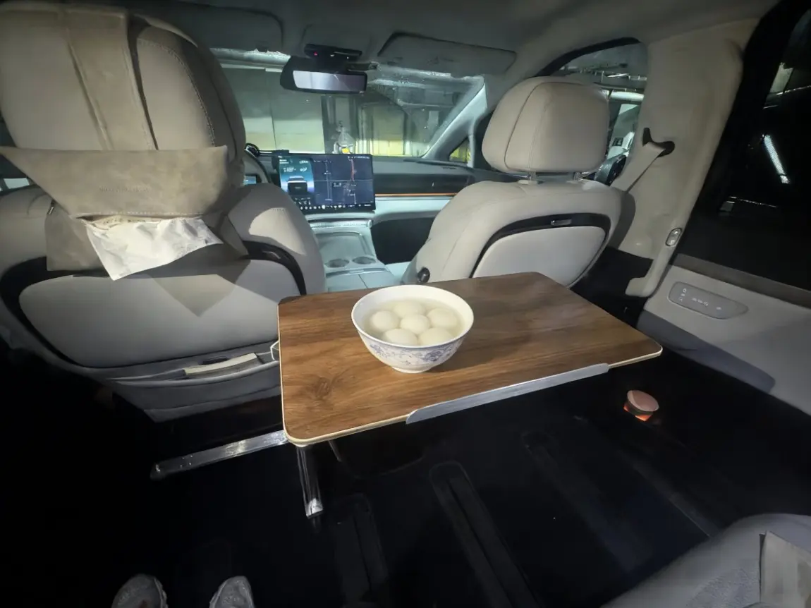 下楼充电期间,是一个人的休憩时间!车里拿出小朋友做作业的大桌板。拼接前排座椅的小桌板,可以变成一个更大的桌板。南方吃汤圆!这不得来一碗热腾腾的大汤圆!独享安逸时光!