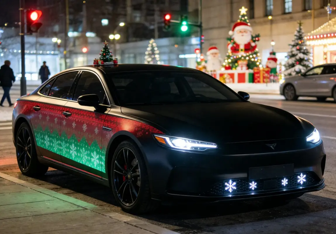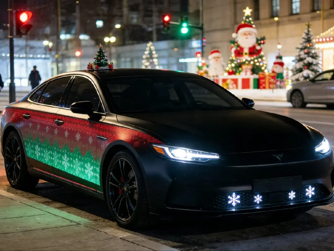 #我的圣诞魔力座驾# 今年圣诞最惊喜的礼物,不是拆到手软的礼盒,而是给我的小鹏M03换上的圣诞限定哑光膜!哑光黑的车身打底,侧面晕染开红绿色的圣诞花纹渐变,像把冬日的圣诞童话揉进了车身线条里;前脸格栅嵌了迷你雪花灯效,一解锁就星星点点地亮起来,车顶还摆了小巧的圣诞树装饰,每次停在路边都能收获路人回头,圣诞氛围感直接拉满。
