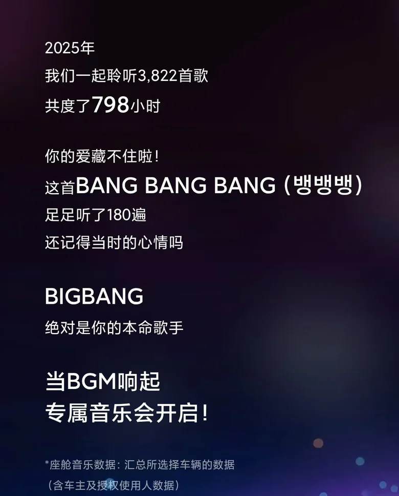 座舱里的日常也够有意思:全年听了3822首歌,BIGBANG的《BANG BANG BANG》循环180遍,通勤路上的BGM直接被它摸清了喜好;3588次召唤小P,调空调、切歌全靠嘴,双手握方向盘的安全感和语音操控的便利,算是被G6焊死了。