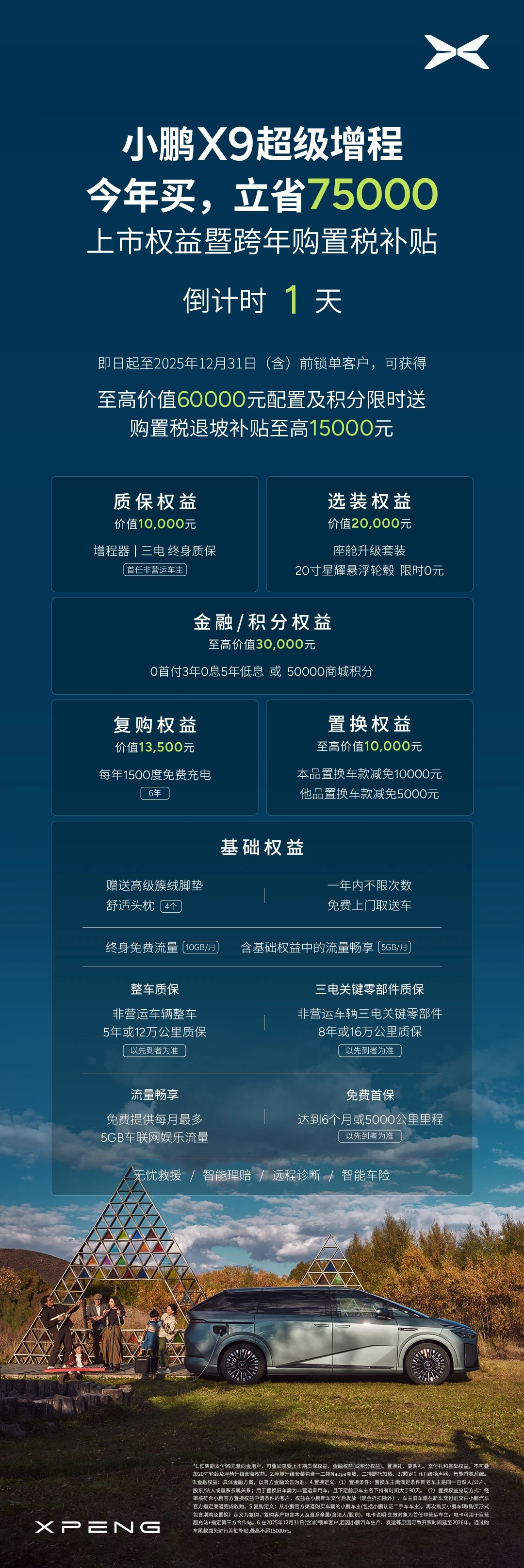 最后1天!小鹏X9超级增程上市权益暨跨年购置税补贴即将截止。