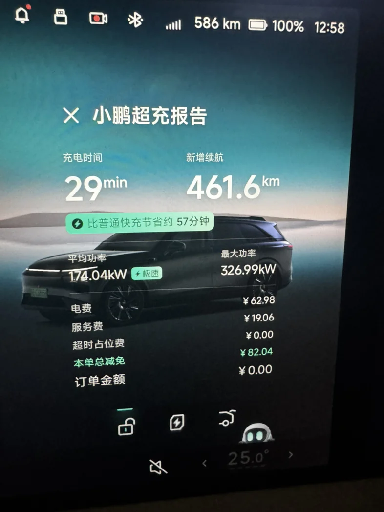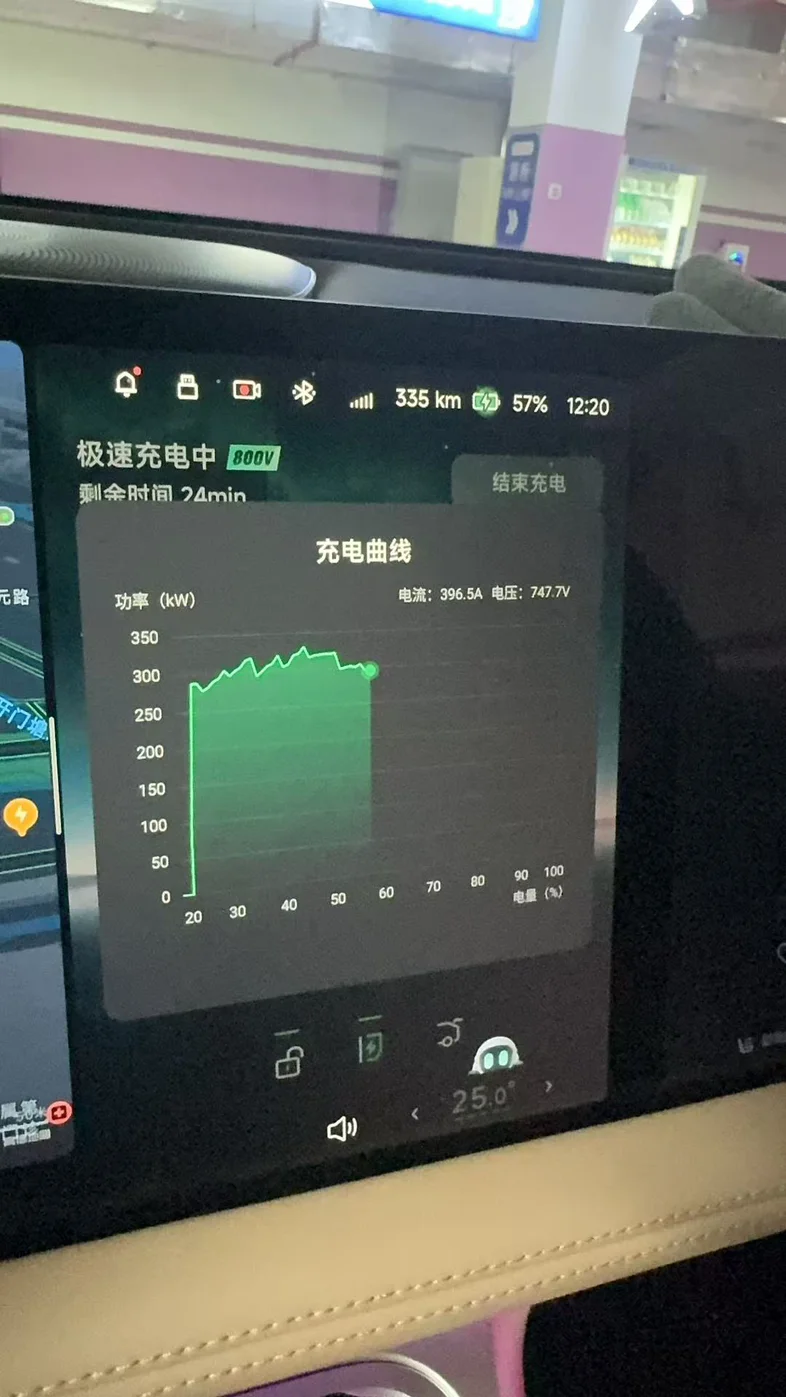 充电体验更是跨越式的进步。P7i搭载的是400V架构,在S5超充桩上最高功率约在180kW左右,已然不错。但G9的全域800V架构,真正释放了充电的速度潜力。在同样的S5超充桩上,平均功率轻松稳定在180kW,峰值功率甚至逼近330kW,充电快得就像一阵清风掠过——不必久候,便能重新出发。