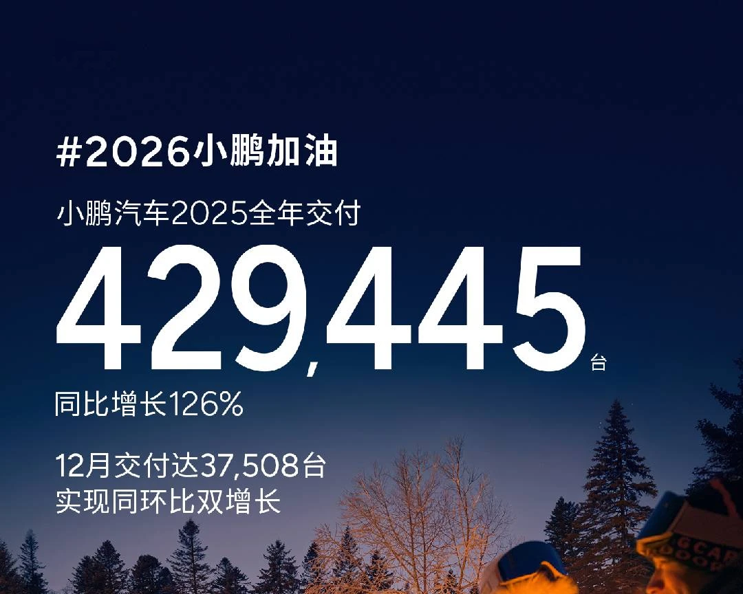 2025年1-12月,小鹏汽车累计交付新车429,445台,同比增长126%,刷新历史年度交付纪录。