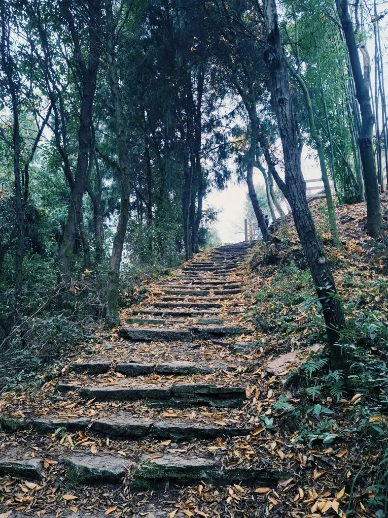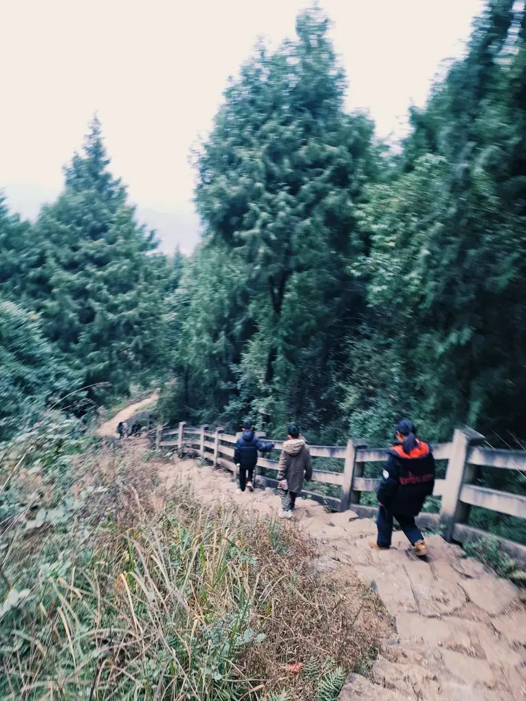 沿着石阶缓缓而上,两旁是高耸的松柏,木栅栏顺着山势蜿蜒。“这山路,倒是有点‘蜀道难’的架势。”抬头望去,山间的雾气还未散尽,仿佛真的能看见千年前那位“诗仙”背着书卷、拾级而上的身影。