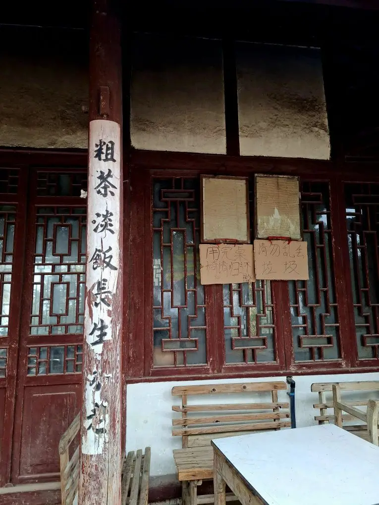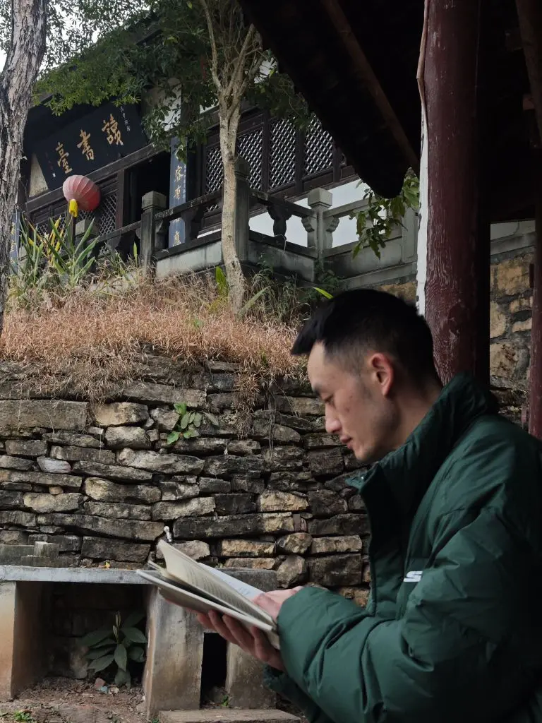 转过一道石门,“读书台”的牌匾突然闯入眼帘。青瓦木檐的建筑依山而建,门前挂着红灯笼,旁边是用石块垒成的矮墙,墙上爬满了青苔。站在廊下,回想从前古人捧着书专注阅读的情景 ——仿佛时空交错,千年前的李白,或许也曾这样,对着山色,诵着诗文。