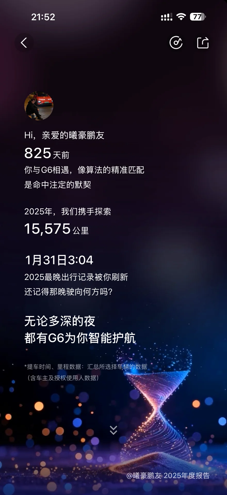 1. 🚗 与我的小鹏G6 四驱高性能Max的缘分始于825天前,这份像算法般精准的匹配成了命中注定的默契。2025年,驾驶G6累计行驶15575公里,足迹遍布不同城市的道路;1月31日凌晨3:04,刷新了2025年最晚出行记录,无论夜色多深,G6的智能护航功能都能稳稳守护每一段深夜行程🌙