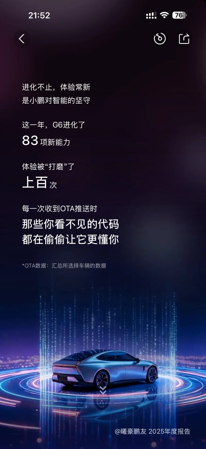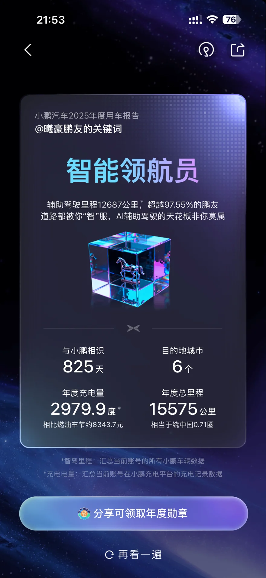 8. 🏆 2025年小鹏年度用车报告中,获评“智能领航员”称号,辅助驾驶里程超越了97.55%的鹏友,堪称AI辅助驾驶的天花板。截至2025年,与小鹏相识825天,打卡6个目的地城市;年度充电2979.9度,相比燃油车节约了8343.7元;年度总里程15575公里,距离约等于绕中国0.71圈,每一段里程都藏着与小鹏G6的美好回忆🏅
