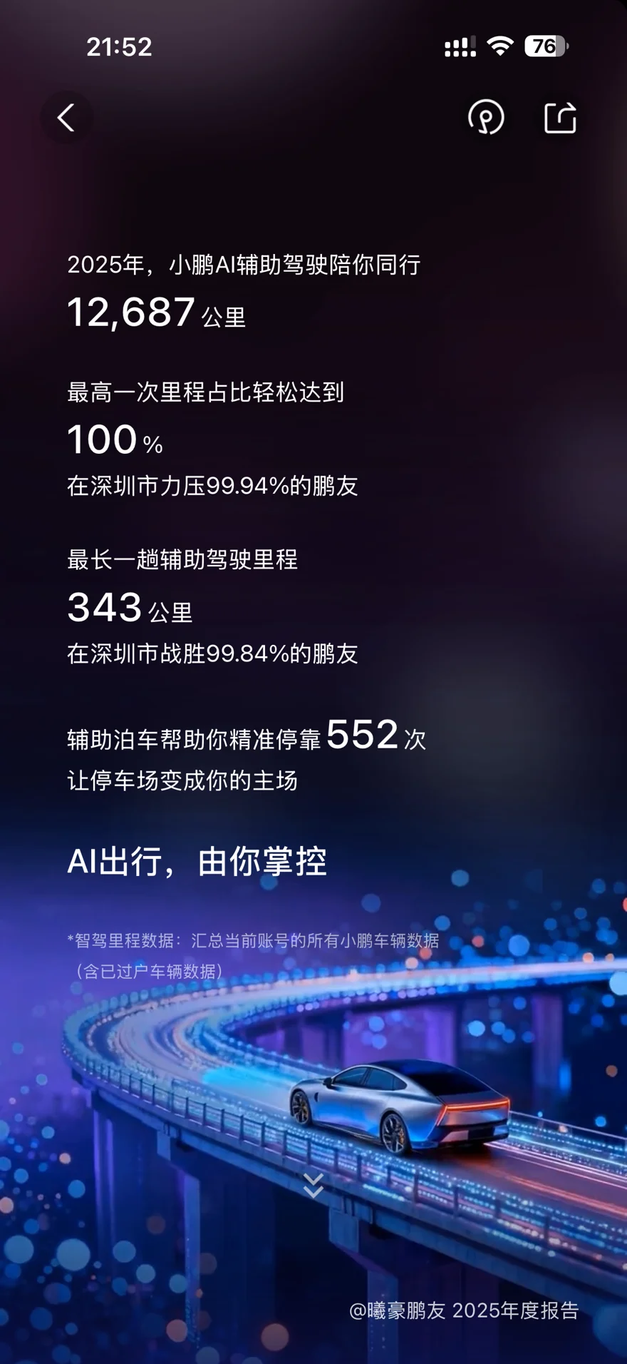 4. 🤖 2025年,小鹏AI辅助驾驶系统陪行12687公里,单次行程中辅助驾驶里程占比最高达到100%,这一成绩在深圳市超越了99.94%的鹏友;最长的一趟辅助驾驶里程达343公里,在深圳市战胜了99.84%的鹏友。此外,辅助泊车功能还精准完成了552次停靠,让复杂的停车场也能轻松成为车主的主场,真正实现“AI出行,由你掌控”🤏