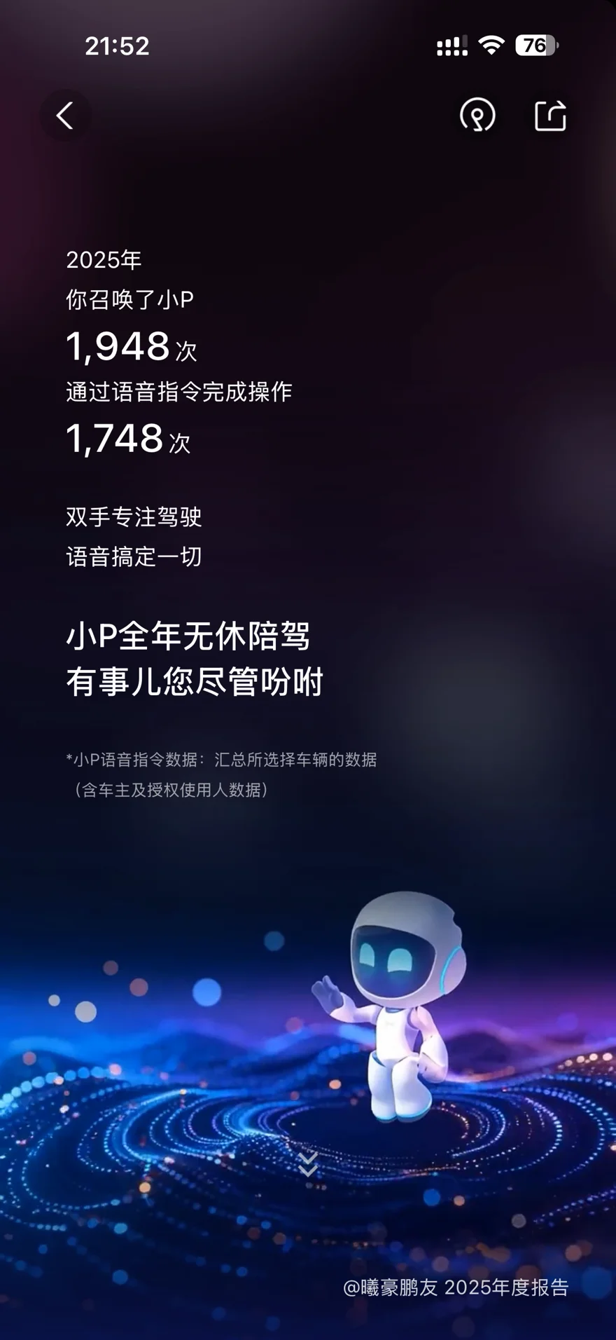 6. 🗣️ 2025年里,共召唤小P语音助手1948次,通过语音指令完成了1748次操作。开车时双手专注掌控方向,空调调节、导航设置等操作都能靠语音搞定,无需分心操作屏幕。小P全年无休地陪驾在侧,随时等候车主的指令,成为出行中不可或缺的智能伙伴💬