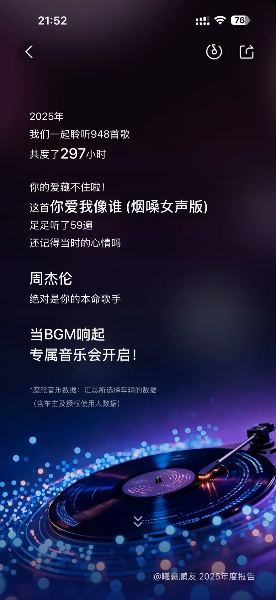 7. 🎶 2025年的驾乘时光里,与小鹏G6一同聆听了948首歌曲,累计在车内听歌度过297小时。其中《你爱我像谁 (烟嗓女声版)》被循环播放了59遍,成了年度最爱的单曲;周杰伦则是当之无愧的本命歌手,他的歌声常伴出行路。当座舱里的BGM响起,专属的车载音乐会便即刻开启🎵