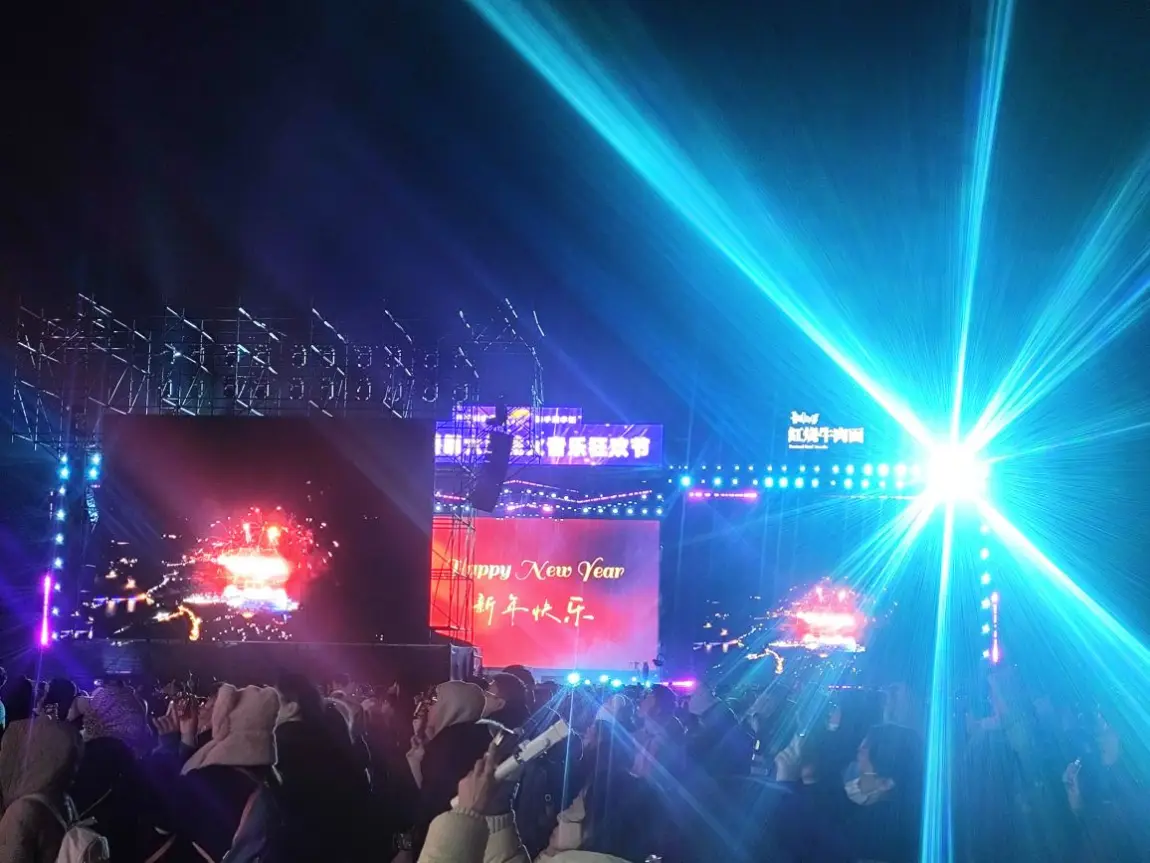 21:00,第一场烟花准时绽放。我们挤在露营岛的人群中,看着粉色樱花状的烟花在250米高空绽放,粉焰漫舞如花瓣纷飞,倒映在湖面形成绝美光影。安安趴在爸爸肩头,小手指着天空喊:“妈妈快看,是樱花树!”妻子握紧我的手,温热的触感在冬夜里格外温暖。烟花落幕,花火音乐狂欢节正式开启,大咖献唱与DJ电音点燃全场,我们随着人群轻轻摇摆,空气中弥漫着欢乐的气息。