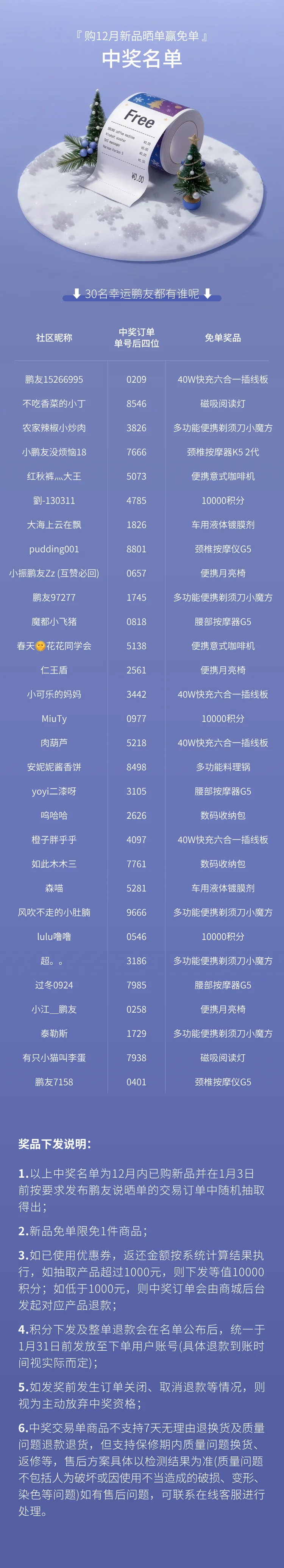 叮咚~购12月新品晒单赢免单活动幸运鹅出现啦~快来看看你的名字在不在这里~相关免单奖励发放说明请参看海报底部内容。