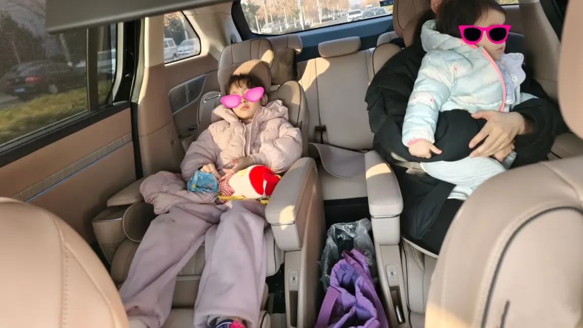 大女儿说这个车大,坐着也舒服,还有电视可以看,她说不用拿着我手机看了