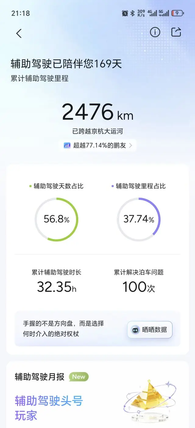 #2026新年愿望# 翻了翻小鹏的辅助驾驶数据,才发现它已经陪我走了169天,累计跑了2476km,光辅助驾驶时长就有32.35小时,就连泊车难题都帮我解决了整整100次,不得不说小鹏的智驾用着是真的香!