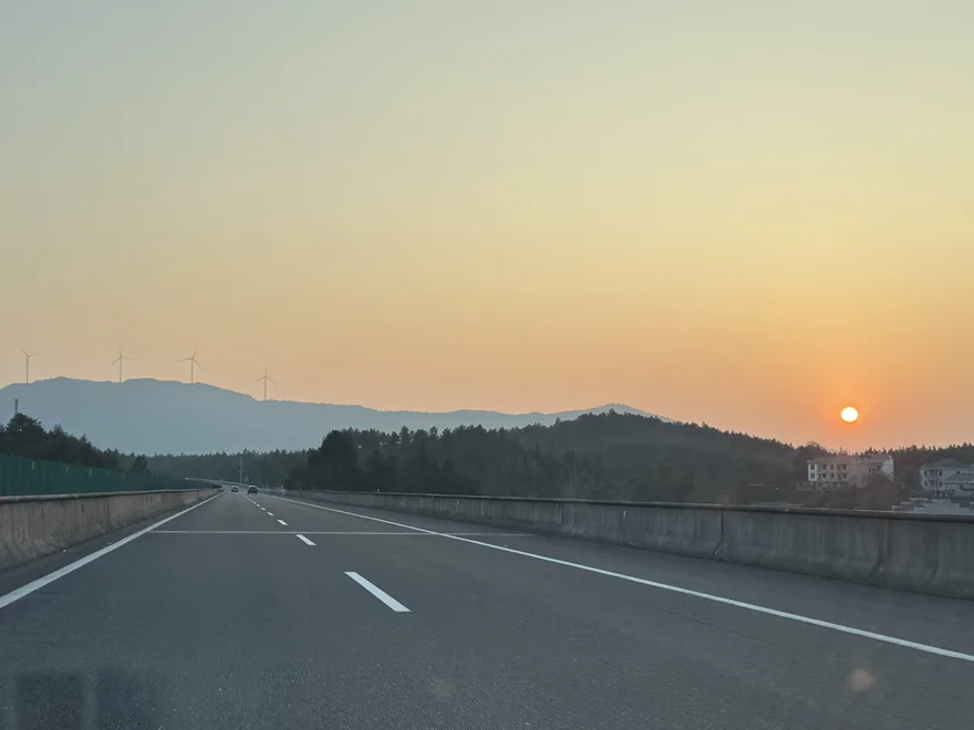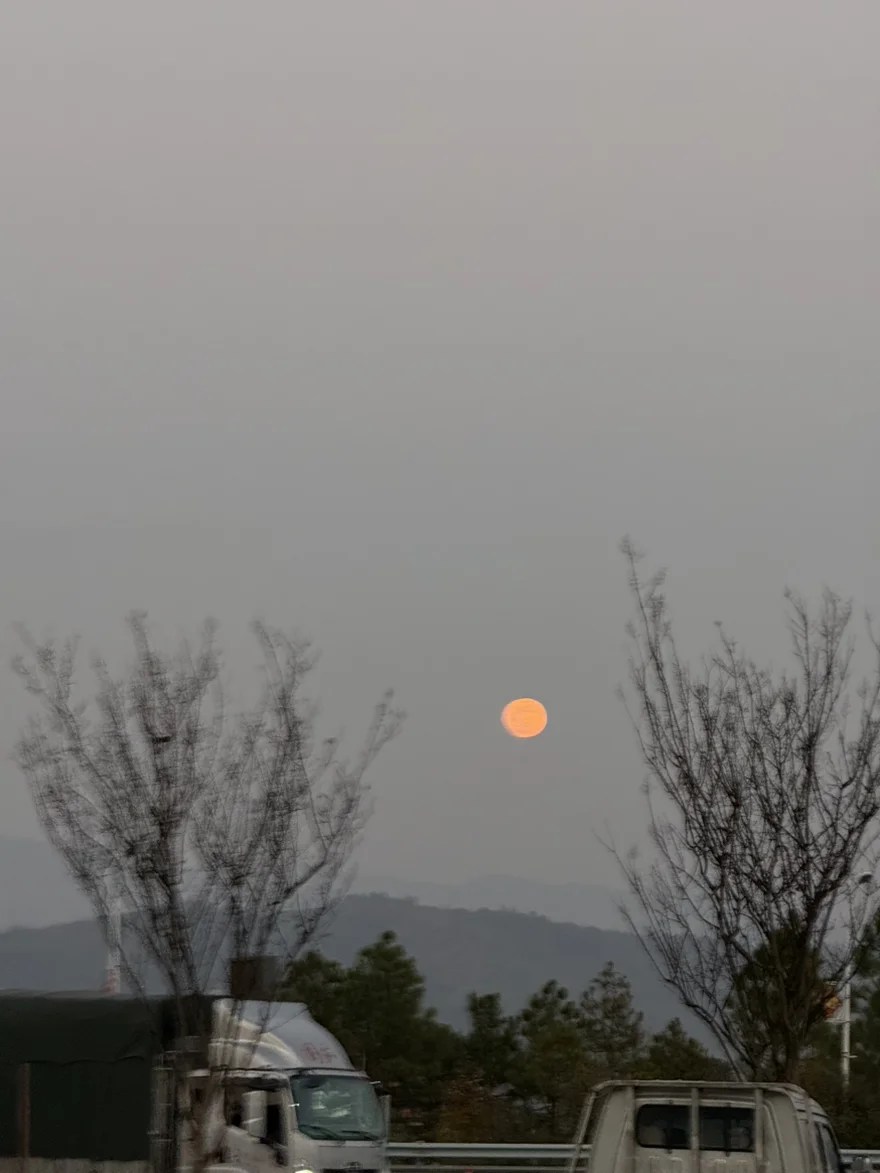 行驶在高速上,恰逢落日熔金,橘红色的夕阳悬在远山之上,公路向远方无限延伸,风车在山间缓缓转动,随手拍下这一幕,竟有种电影画面的质感。行至中途,天边又挂起一轮朦胧的橙月,透过光秃的枝桠望去,月色温柔得抚平了赶路的疲惫。