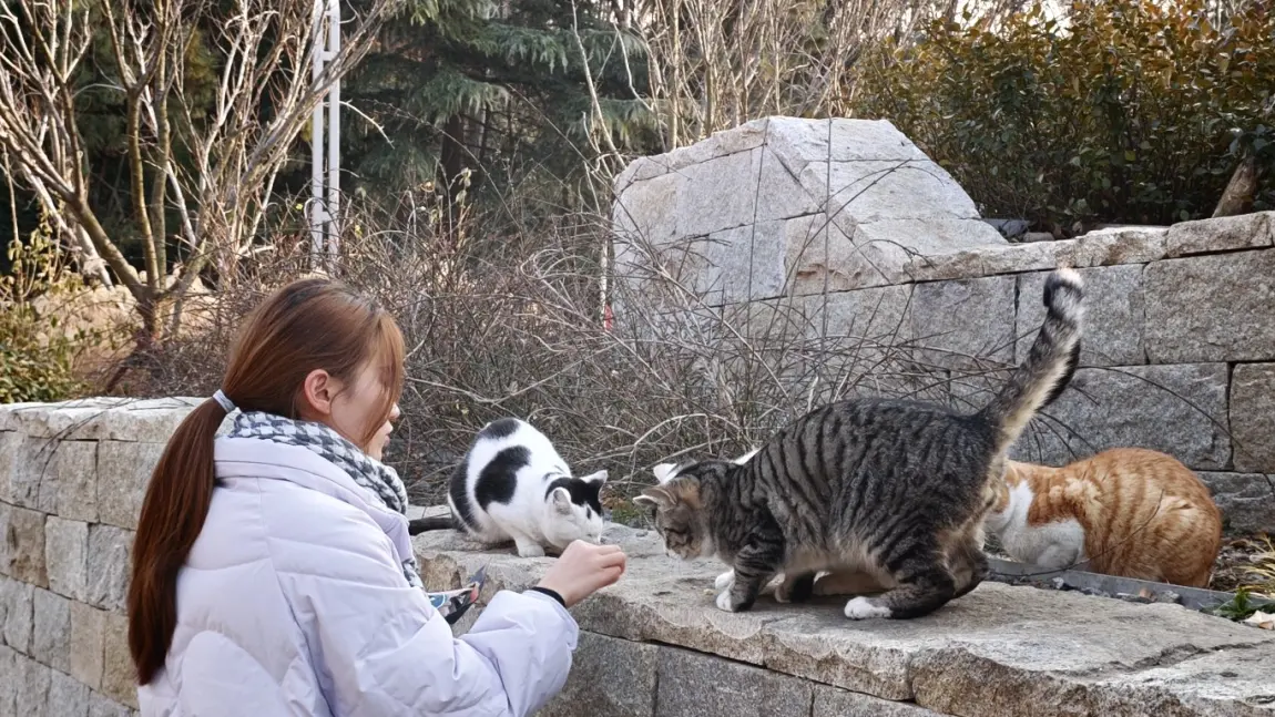 计划了很久的看日落,却因为天气的原因一直没能如愿。没想到新年伊始就碰到了好天气,趁着去小鹏银川西路售后保养的间隙,正好从浮山森林公园的西门出发去看日落,往上爬一会就看见浮山上的小猫们。呼喊一声“咪咪”,七八只小猫就围了上来,非常亲人。