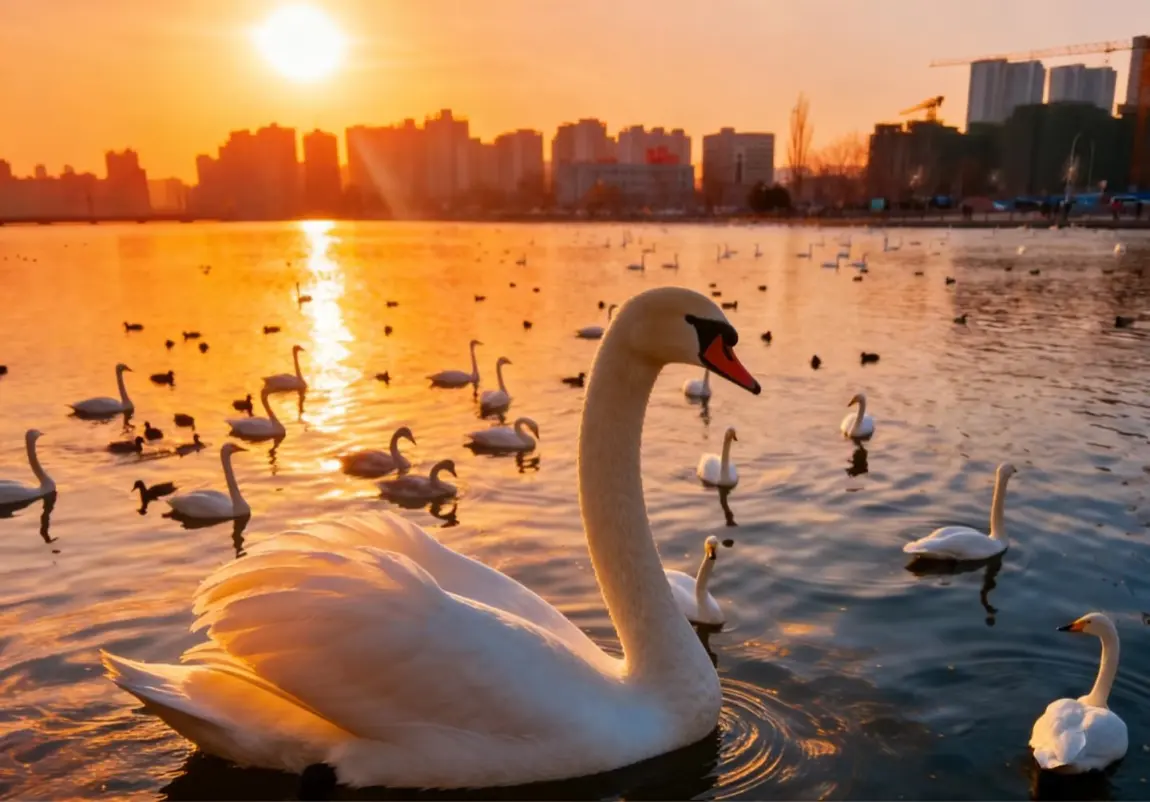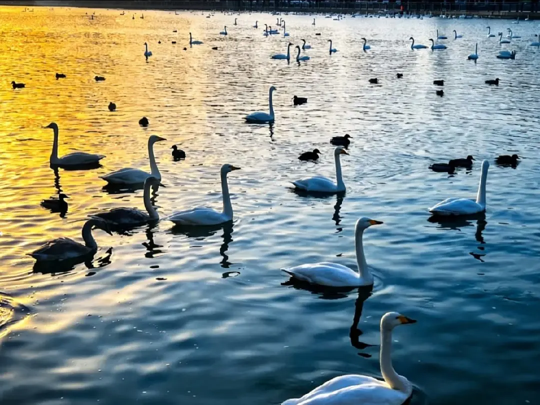 2. 孔雀河四中附近流域:冬日的孔雀河水面澄澈如碧,湛蓝的天空与洁白的天鹅相映成趣,岸边的芦苇荡随风摇曳,是拍摄天鹅剪影的绝佳场景。清晨或黄昏时分,阳光斜照在水面,波光粼粼中天鹅翩 跹,宛如童话世界。
