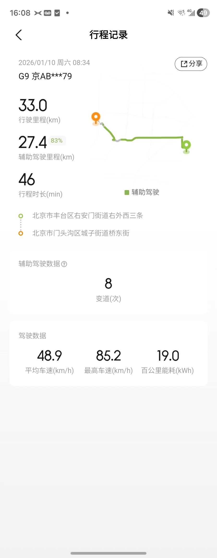 上午来回60多公里,大部分是用NGP,唯一的不好就是,路中间有一个大的黑色塑料袋,导致出现了紧急刹车,着实被吓了一跳,接下来表现真是太满意了。使用NGP还有一个好处就是能耗做到最优,在这个天气温度下能做到百公里15以下的能耗,是一个相当满意的结果!