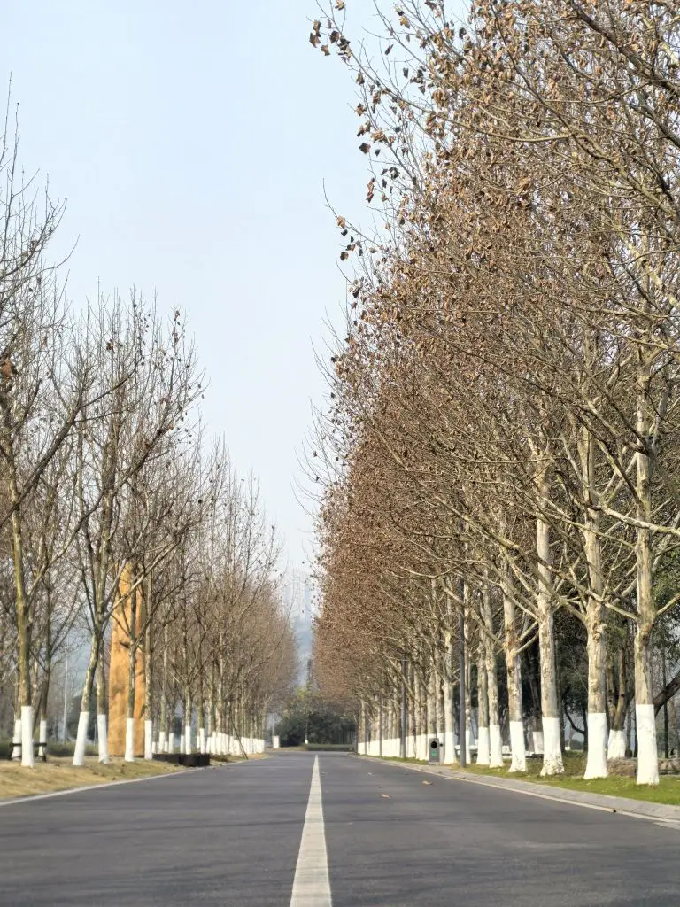 黄叶落而不光,行道树排列整齐,岛上的冬日风景让人感到温暖舒适