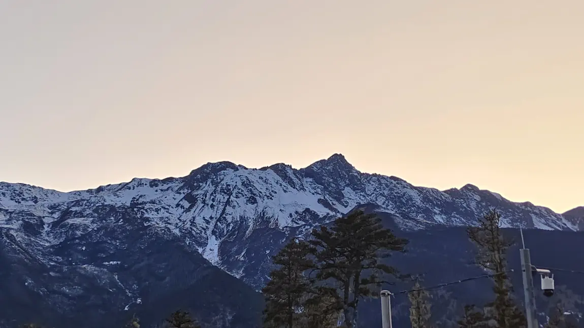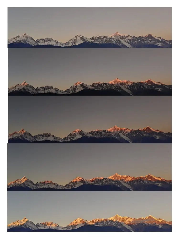凌晨六点,闹钟还没响,我们就出发前往飞来寺观景台。夜色未褪,雪山的轮廓在墨蓝色的天幕下格外清晰,寒意刺骨,却抵不过心中的炽热。八点刚过,第一缕金光刺破云层,落在卡瓦格博峰的顶端,紧接着,金色的光芒顺着山峰往下蔓延,整座雪山仿佛被点燃,熠熠生辉。那一刻,天地间一片寂静,只剩下相机的快门声和彼此抑制不住的惊叹,所有的奔波与等待,都在这鎏金的瞬间有了圆满的答案。