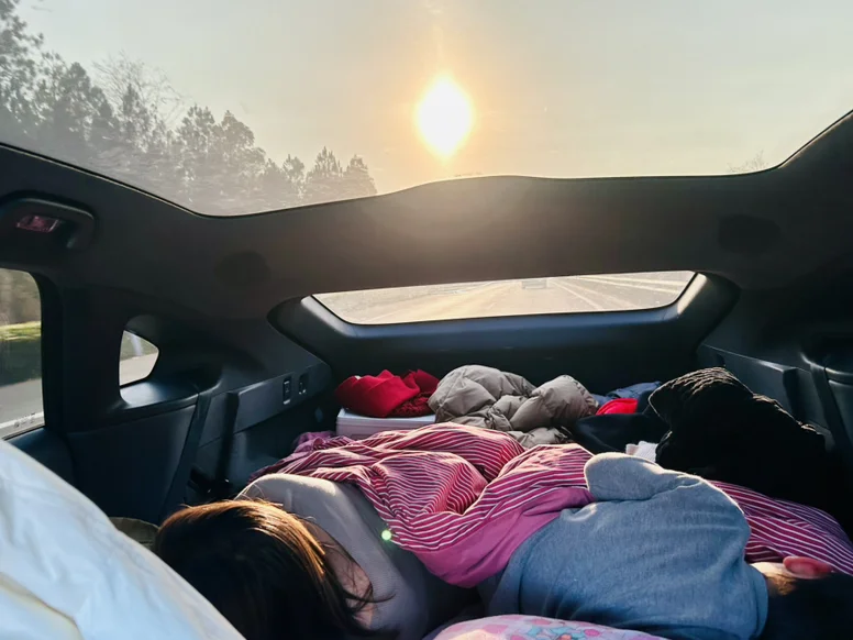 没有行李,但是把P7➕的后排放倒,铺好床,那就是把整个家带上了旅程。
