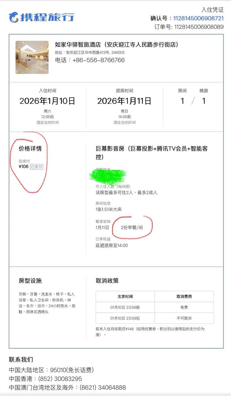 不得不单独拿出来说一下,安庆的物价简直让我泪流满面,本来计划直接床车旅行,但是当我打开携程看了一眼,只能说,何必苦了自己。选了迎江寺附近的如家华驿智旅酒店,巨幕影音房才106块,还含早餐,性价比绝了!