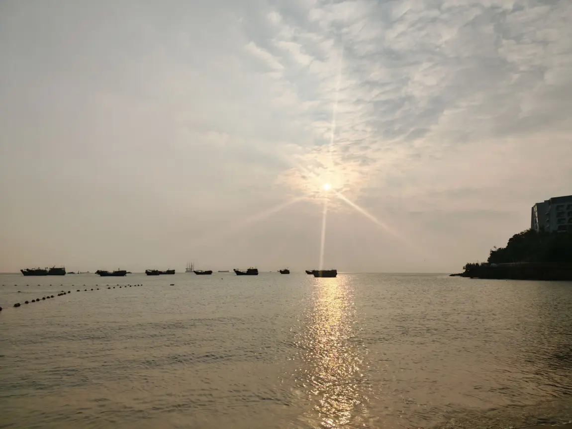 放下行李,我迫不及待地奔向此行最期待的南沙湾。远远望去,沙滩像一条柔软的银带,被阳光晒得暖洋洋的。脱了鞋踩上去,细沙细腻得像面粉一样,从脚趾缝间溜走,痒痒的却又很舒服。海水是那种层次分明的蓝,由浅入深,清澈见底。我坐在沙滩上发了很久的呆,看着浪花一遍遍涌上来又退下去,听着涛声,仿佛整个世界都安静了。