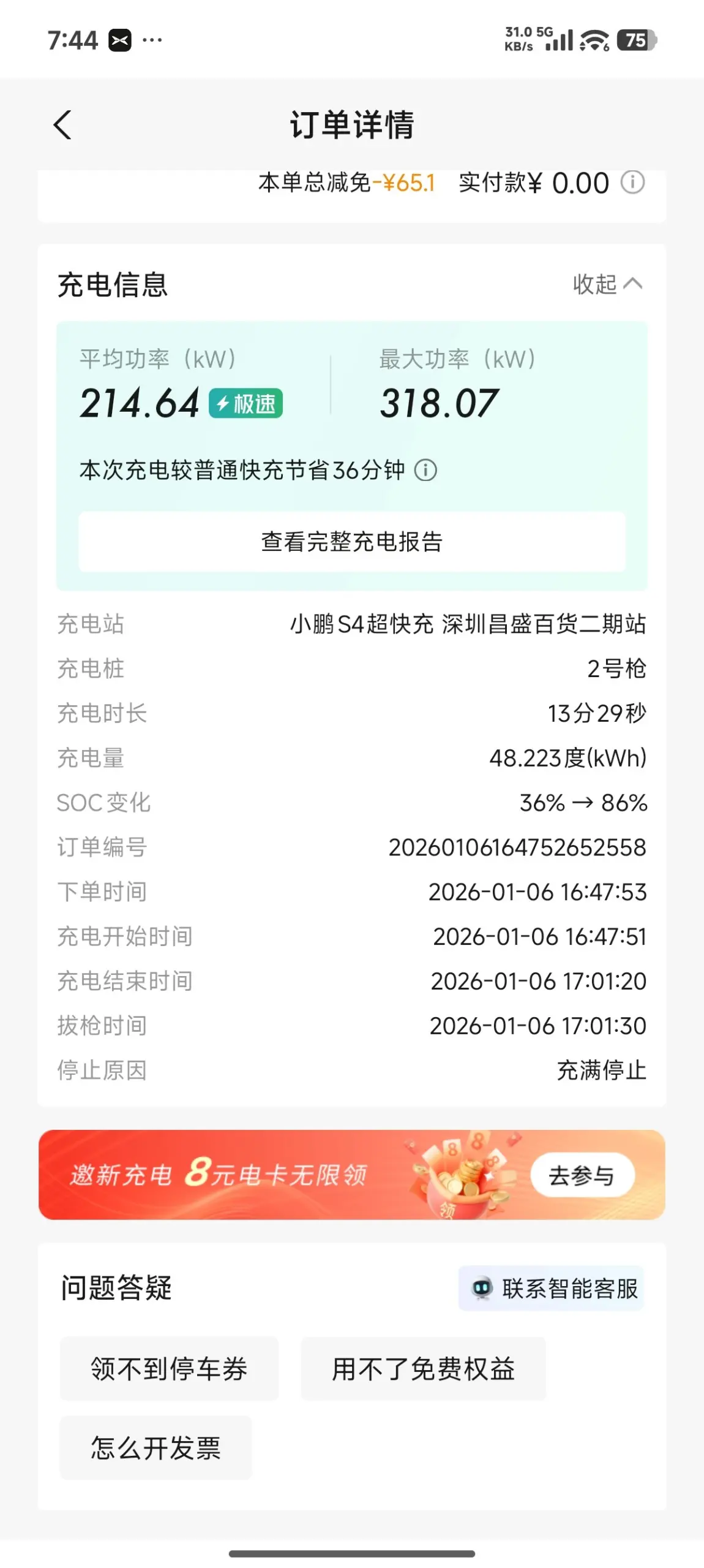 回去的时候还剩下百分之四十多的电,还剩下两百多公里,生怕不到随便在附近找了个小鹏 s4 超充,充电还算满意百分之四十多充到百分之八十多只用了十分钟不到(周围车都是满的插着枪功率一直比较的平稳)