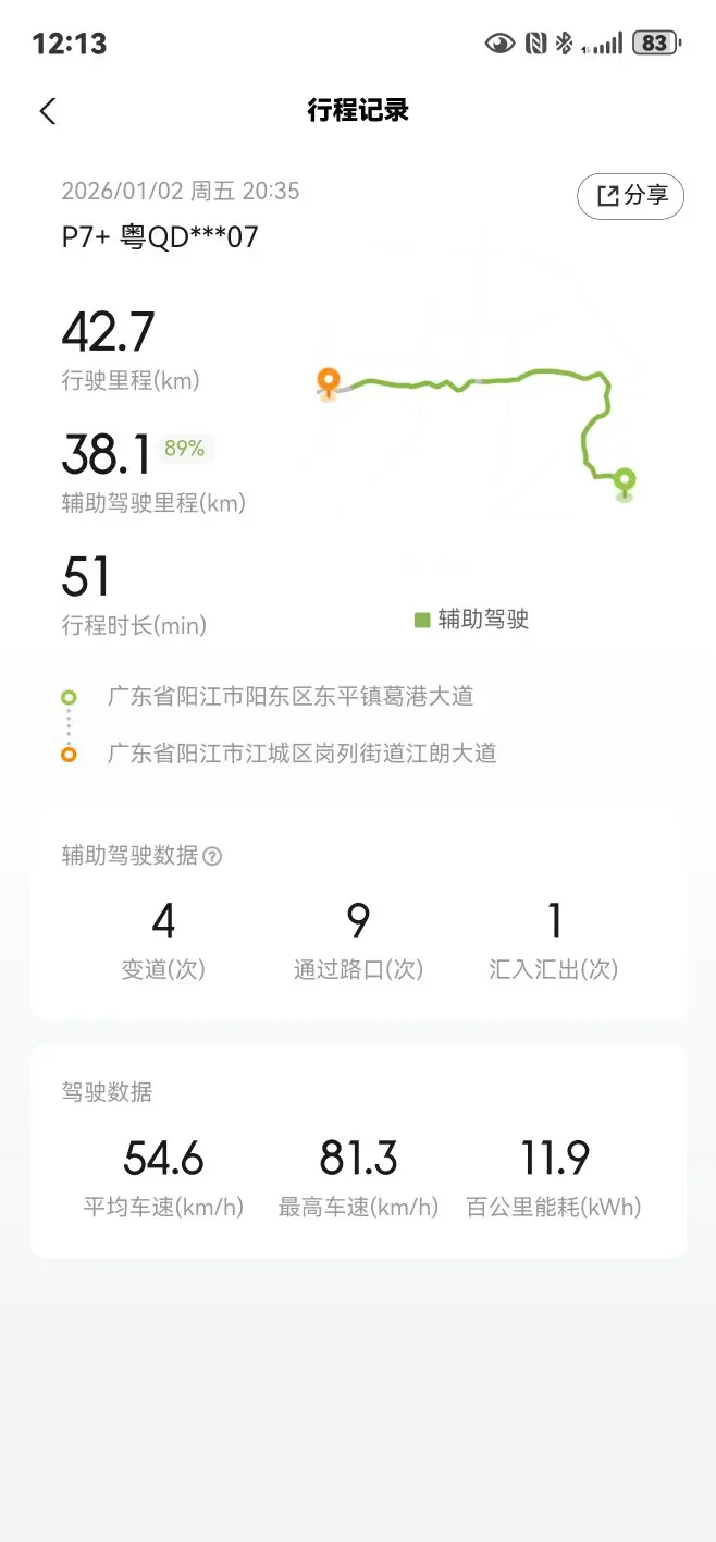 为了省下高速费,全程选了国道行驶,小鹏P7+的NGP辅助驾驶成了旅途的“神队友”。往返八十多公里的路程里,辅助驾驶里程占比近九成,变道、过路口都稳稳当当,不用时刻紧绷神经,反而能慢慢感受沿途的风景。