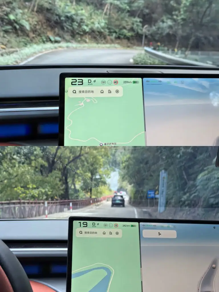 · 续航实测:当日气温14℃,山区约10℃。出发WLTP约520km,全程山路+空调+座椅加热,表显能耗14.2kWh/100km。惊喜点:下山段动能回收使续航从239km增至242km!