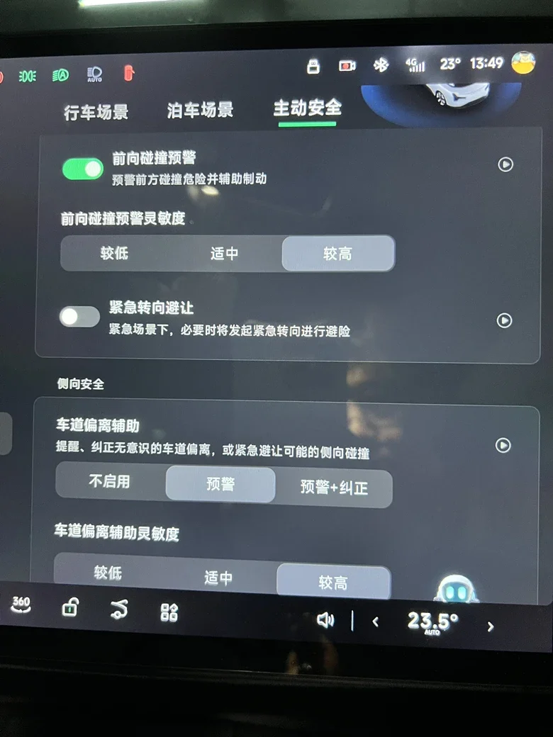 3、主动安全中,能打开的尽量都打开,所有选项都选择较高,比如向前碰撞预警灵敏度等等