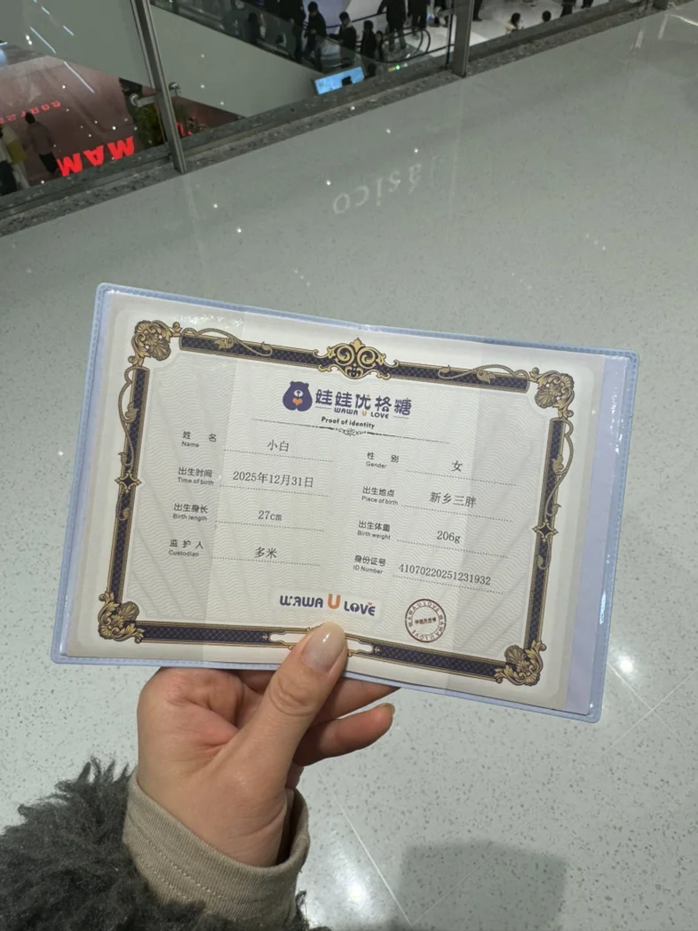 在新乡胖东来,孩子体验了DIY娃娃项目。她认真挑选衣服、设计造型,最终完成了一个专属娃娃。最有意思的是,工作人员提供了一张娃娃的“出生证明”,上面详细记录了制作时间、地点和“监护人”(即孩子的名字),这个创意让孩子爱不释手,也成了这趟旅行中最特别的纪念品。