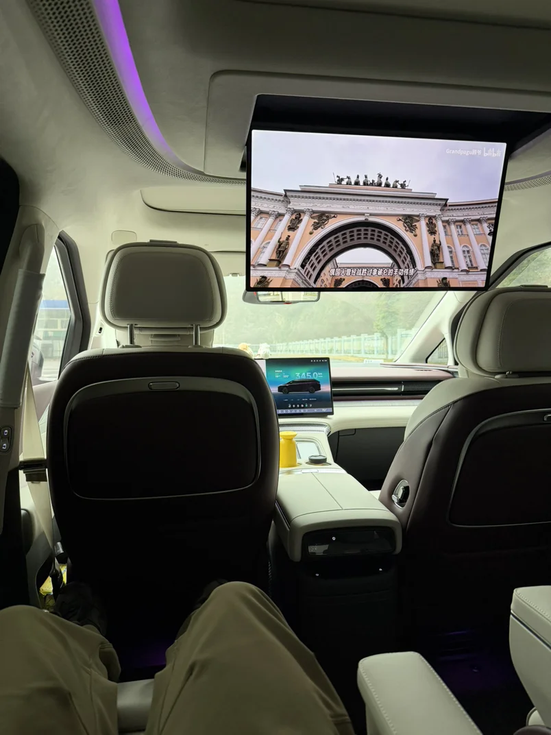 作为家里的主力驾驶员,X9的驾驶感受颠覆了我对大型MPV的认知。5.3米的车长却有着5.4米的最小转弯半径,搭配主动式后轮转向,在狭窄的小区道路或乡镇小路掉头、会车都格外轻松,再也没有开大车的笨拙感。动力输出平顺又充沛,增程器介入时的噪音≤0.5dB,加上双层夹胶隔音玻璃和主动降噪技术,车内始终保持着纯电级的静谧性,但是高速行驶时的风噪还是难以忽略,但开久了不会觉得疲惫。底盘的滤震效果也很出色,过减速带或细碎坑洼路面时,颠簸感被过滤得很干净,家人坐在后排几乎不会感受到船感,有效减少了晕车的可能。