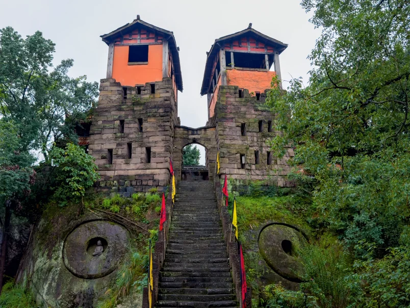 沿着石阶攀登,沿途可见龙门关、巴王石等景点,每一块石头都刻着巴国历史。登顶龙台能俯瞰广安市区全景,风大的时候打开小鹏的座椅加热,瞬间暖意融融。