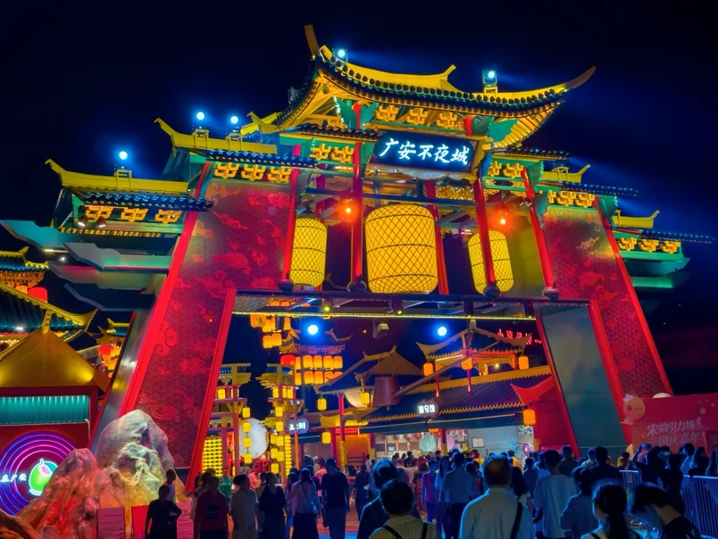 夜幕降临,直奔广安不夜城,这里是川东首个宋朝沉浸式演艺街区,刚到门口就被飞檐翘角的宋式牌楼吸引,大红灯笼高高挂起,氛围感拉满。