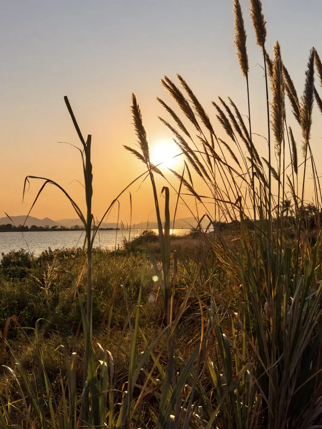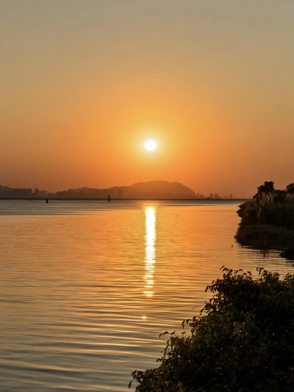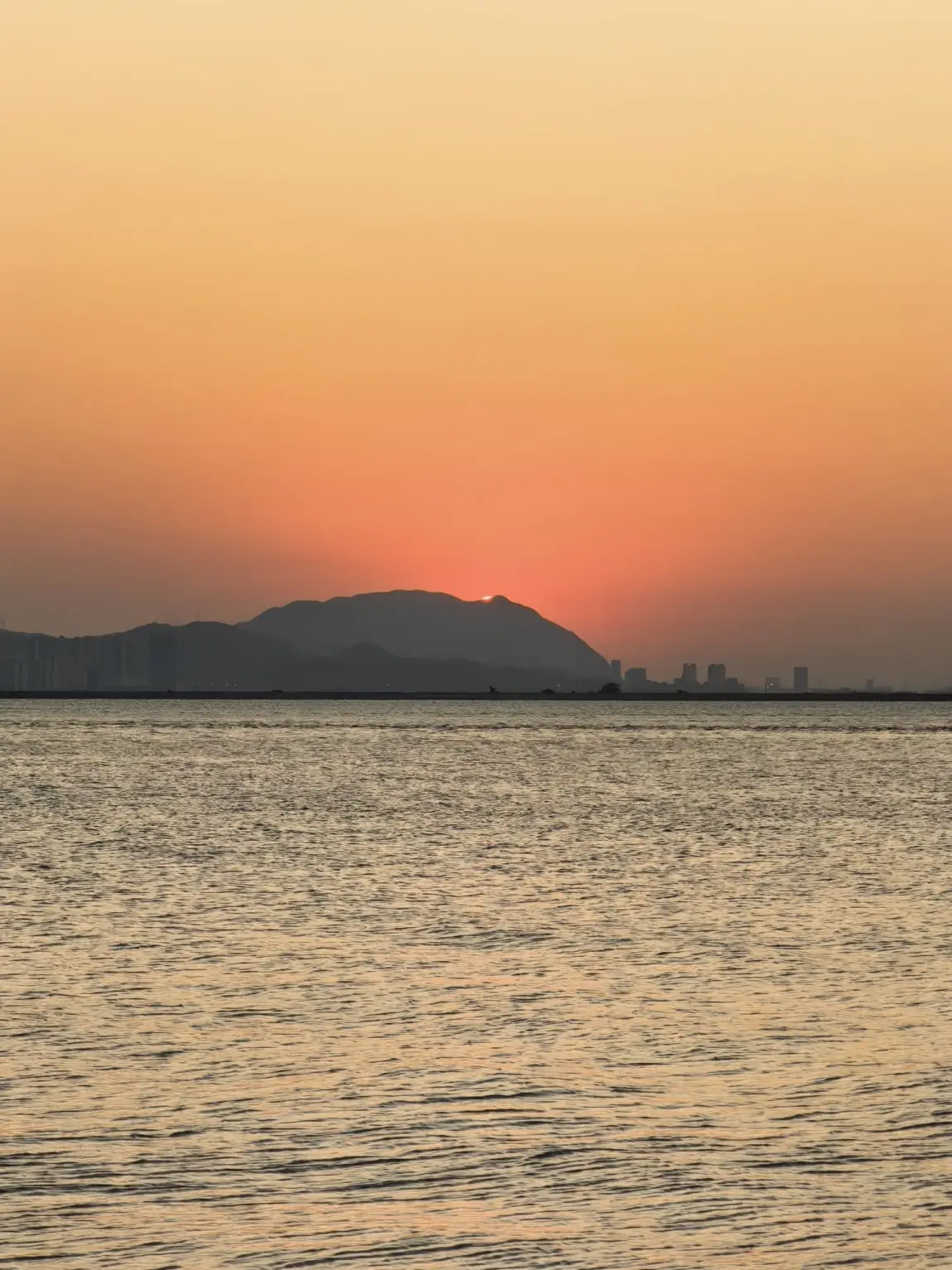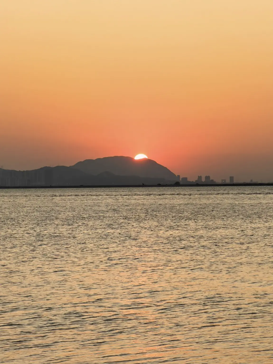 蹲十分钟,天沉成橘红,太阳露小半张脸时风都静了 —— 周围没喧闹人声,只有水鸟偶尔扑棱,我抱着相机坐长椅上,看太阳慢慢 “陷” 进山后,直到天边缘晕出浅粉,才惊觉自己在这儿赖了四十分钟。