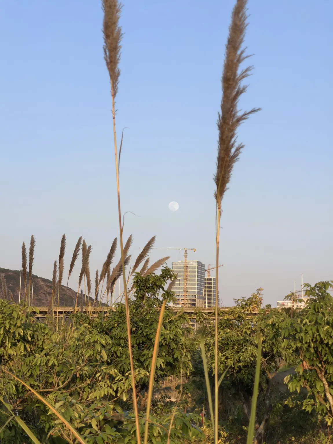 逆光看过去,芒草绒毛边泛着软光,伸手碰一下,细碎草絮飘在风里落进外套口袋,连指尖都沾了点暖。走到中段时,芒草后突然露出高楼轮廓,却一点不违和:月亮已经慢慢淡入天空,远处起重机慢腾腾动着,近处芒草晃得悠闲,城市的忙和湿地的慢,像给我前紧后松的假期做了个温柔过渡。