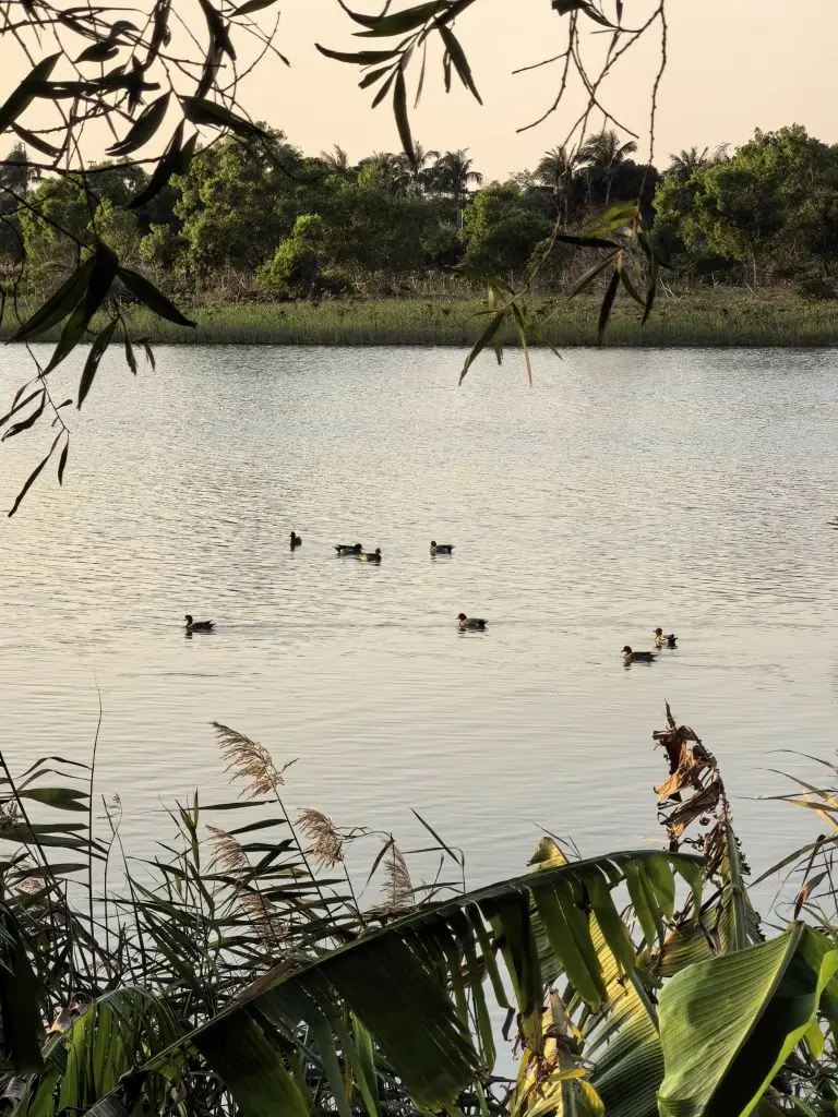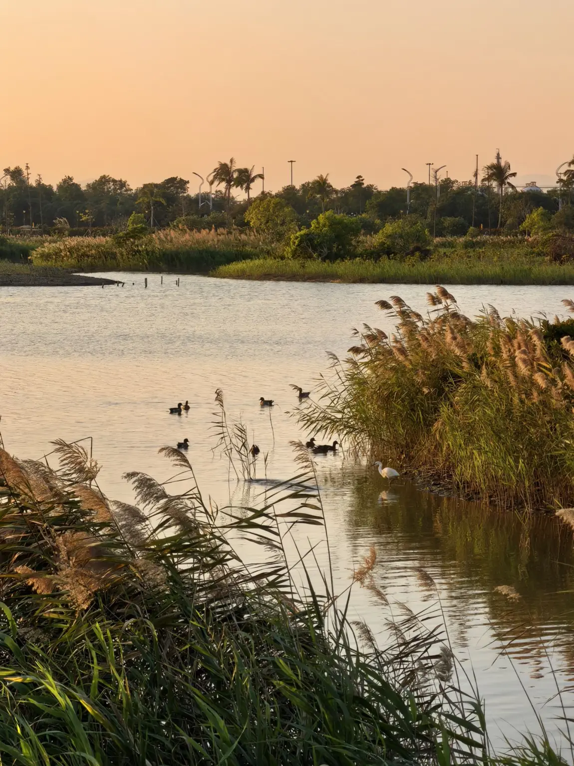 沿着水边逛,镜头里突然闯进 “小客人”:棕褐色鸭子贴着水面划,翅膀点水时把落日碎光搅得更晃,旁边白鹭缩着脖子啄水草,动静慢悠悠的。