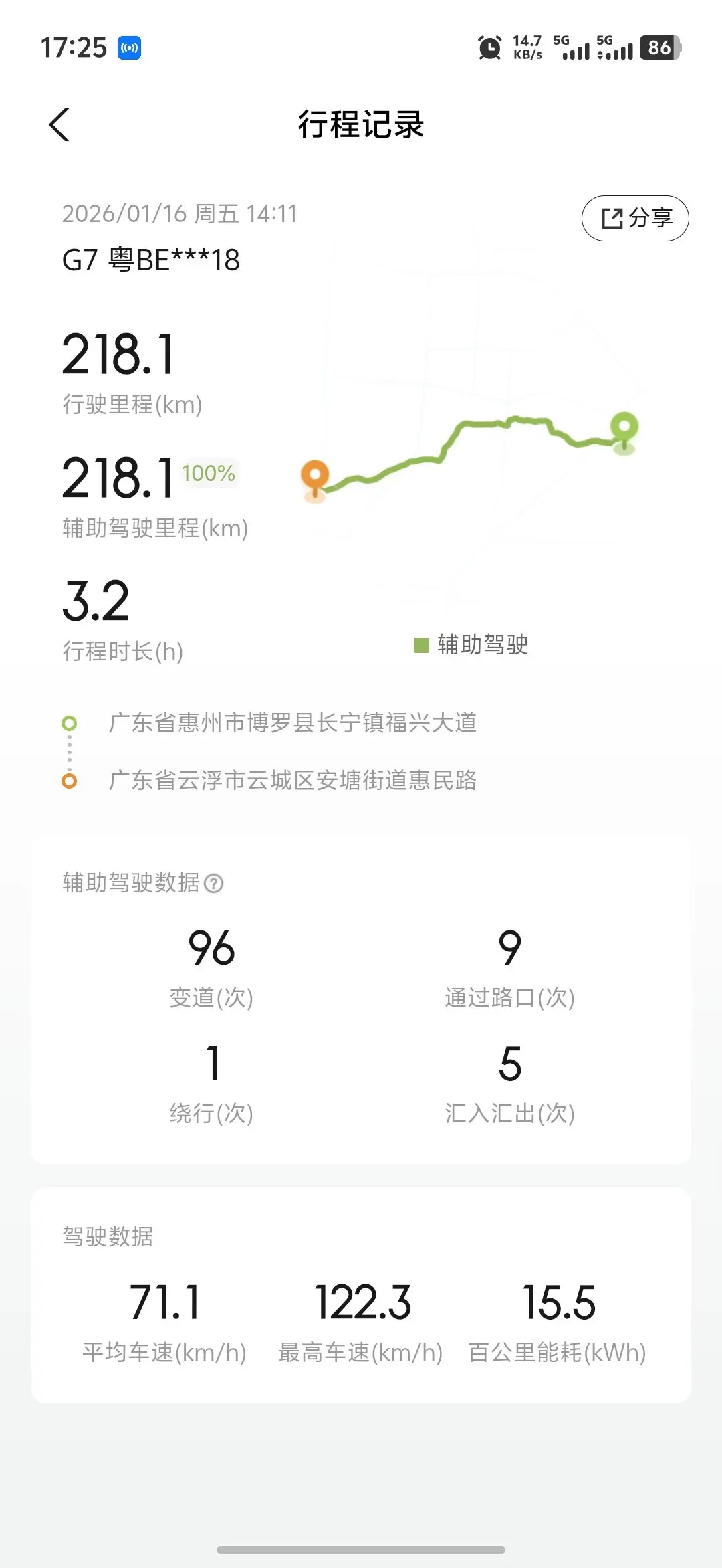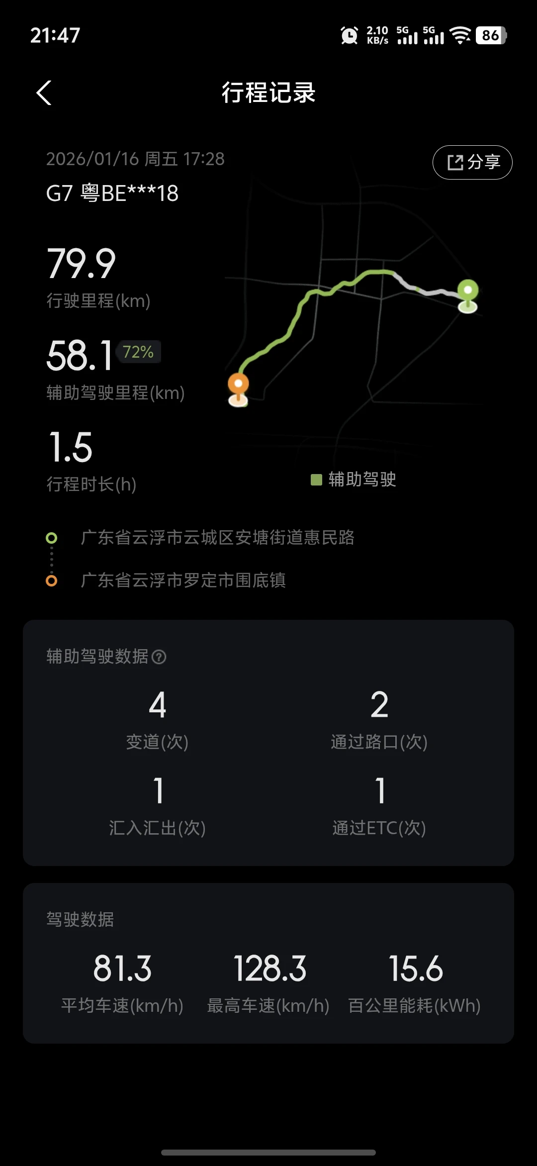 分两次开了300公里,中途去了一次服务区,全程自动空调25度,一个人,一台电鸡,一车乱七八糟的东西打包带回老家。前段全程用NGP跑,后段自己稍微狂飙了一下,又交回NGP了,平均能耗15.5。