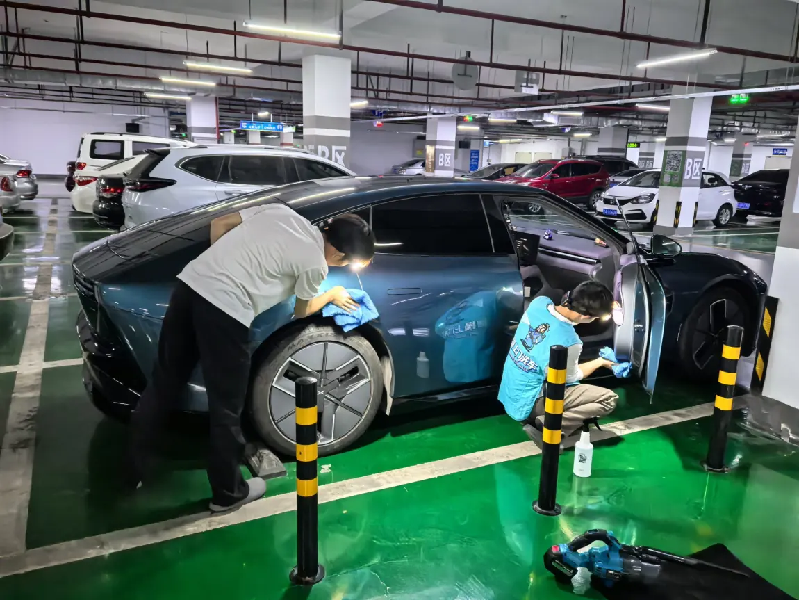 虽然费用比洗车店的贵了些,但是大半夜的,而且还是纯人工手搓(两个帅小伙骑着电动车)真的很不容易。。