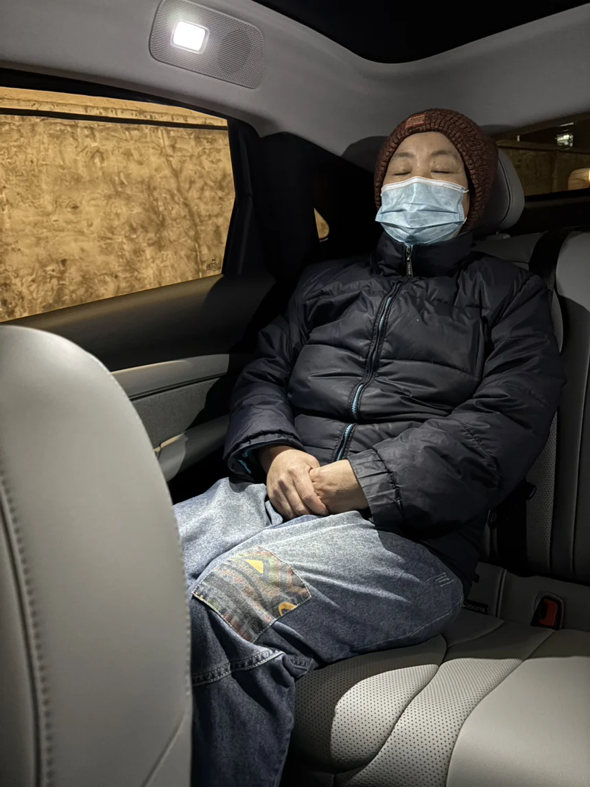 带妈妈出去玩,她在后座安稳睡着。车窗外的风景流过,车内只有轻轻的呼吸声——这就是幸福吧。