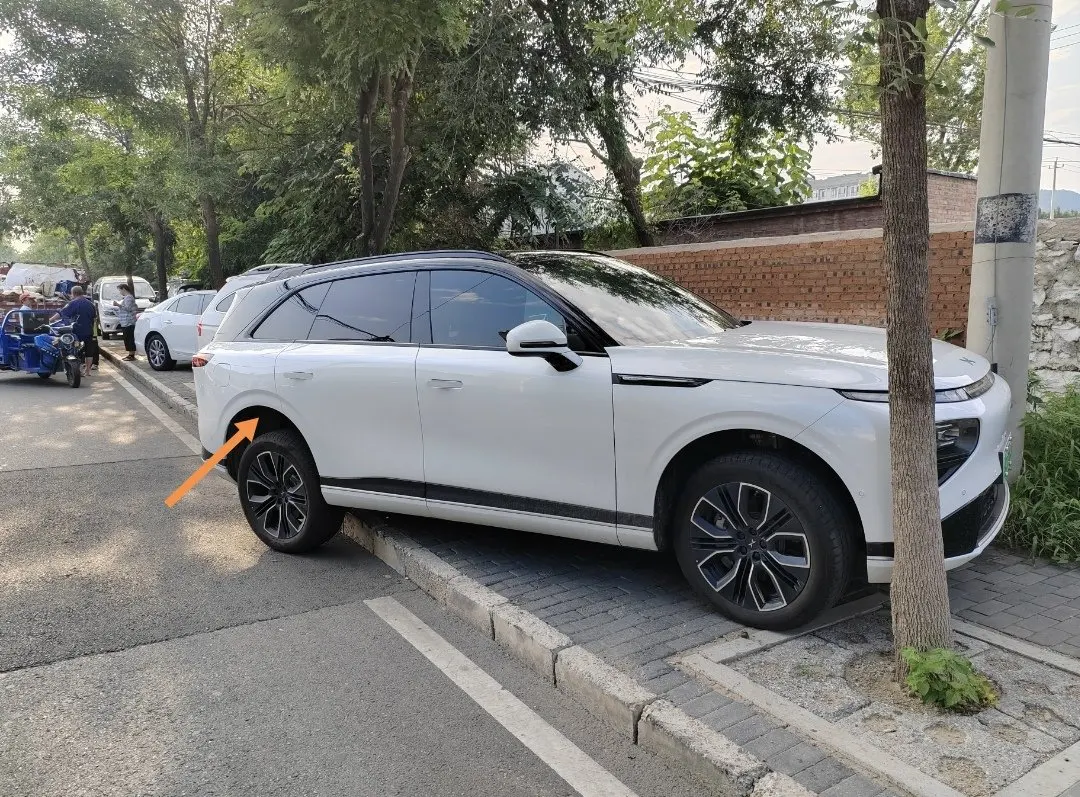 7、第一次体验空气悬架,不用则已,一用惊人,路肩停车自由。注意看图片箭头位置,后轮悬挂自动提高调节,保持车身稳定。大丈夫能屈能伸,能上能下。