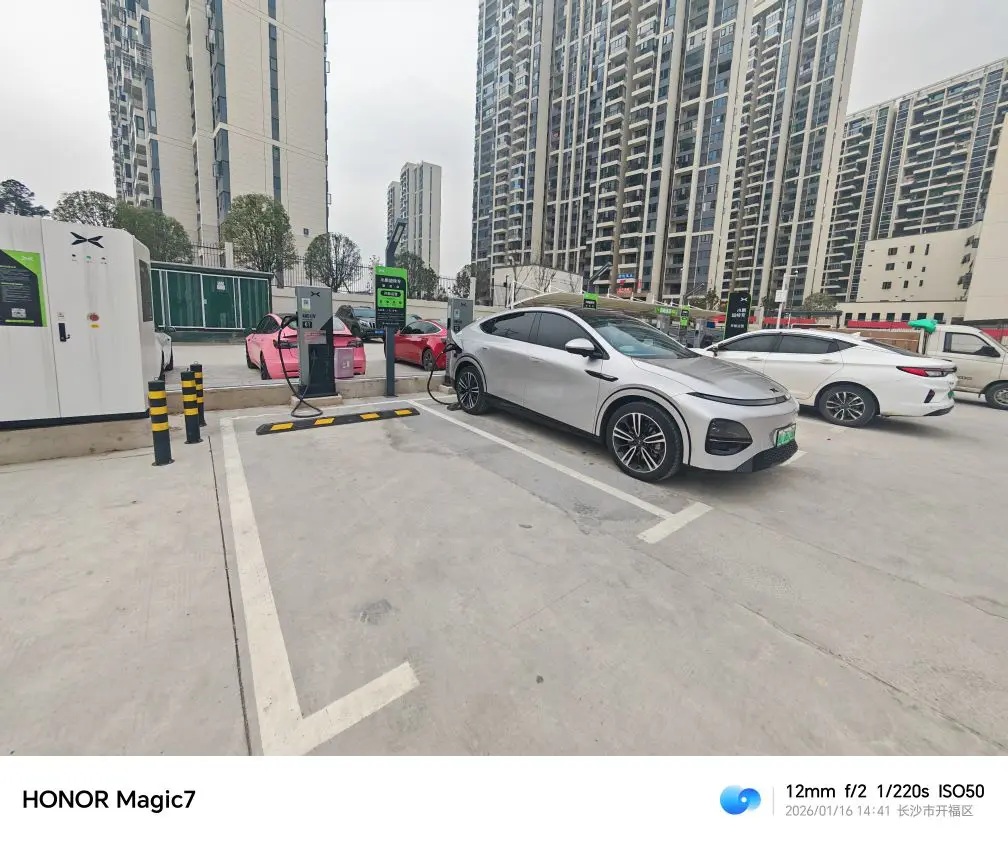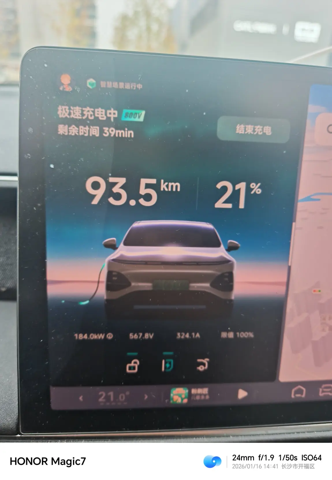 一路向东,抵达长沙后直奔小鹏超充站,解锁新年首次超快充体验。插上充电枪的瞬间,功率迅速攀升至184kW,电压与电流稳步跳动,看着剩余电量从21%逐步上涨,表显续航一点点回归,那种踏实感不言而喻。依托800V高压平台的优势,补能效率肉眼可见,短短几十分钟就能满电复活,期间正好舒展筋骨,感受长沙的城市气息。超充站完善的配套与清晰的车位指引,让异乡补能也格外顺畅。