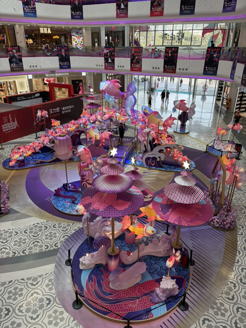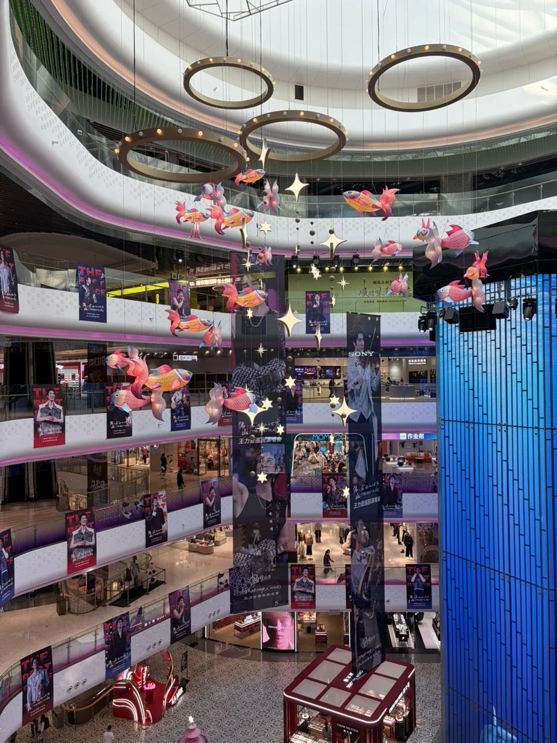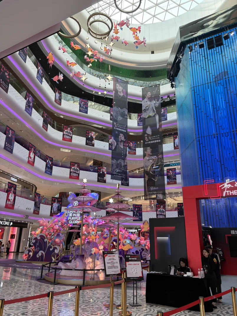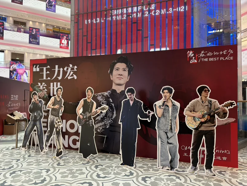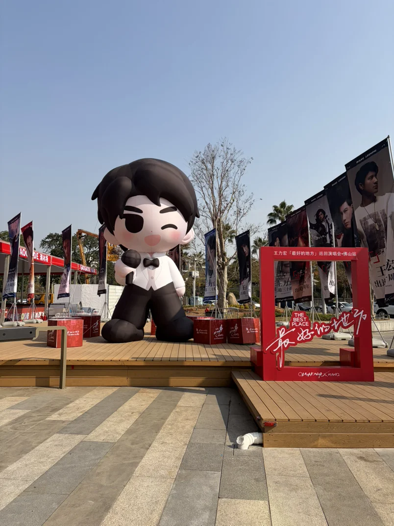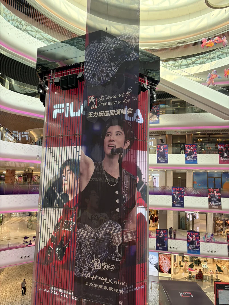 刚好遇上了王力宏前一天在佛山开了演唱会,这次算是真切的感受到粉丝追星应援的那种震撼!商场的每个中庭都挂满了王力宏大大小小的各种海报、置景装置以及商场外广场的巨大充气人偶……