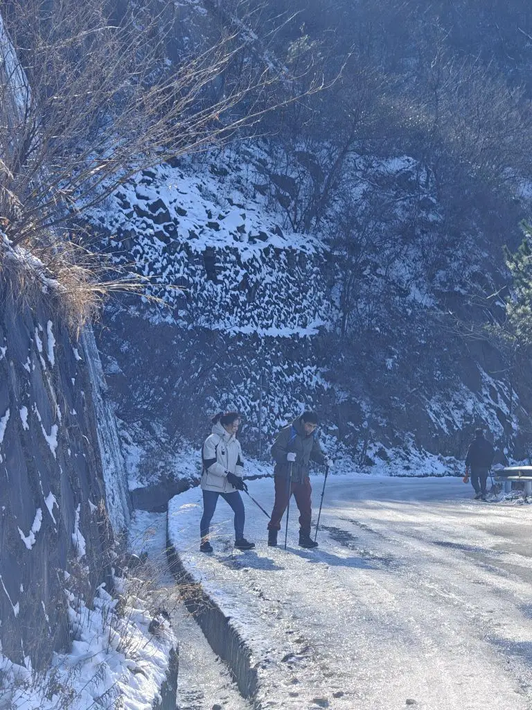 浙江临安的龙王山看雪,阴暗处路上结冰很厚,车子不敢开上去,停在大家都停的路边,路上还摔了2跤,吓死了!因为本来脚踝今年5月份就受伤了!