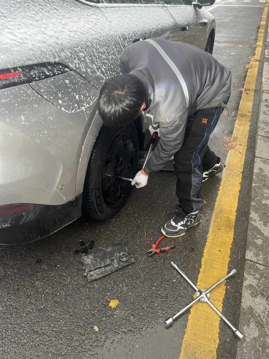 轮胎扎了一个小钉子,补了两次气都没发现漏点,还是申请了小鹏客服,上门服务,下雪天都来了,相当感动。