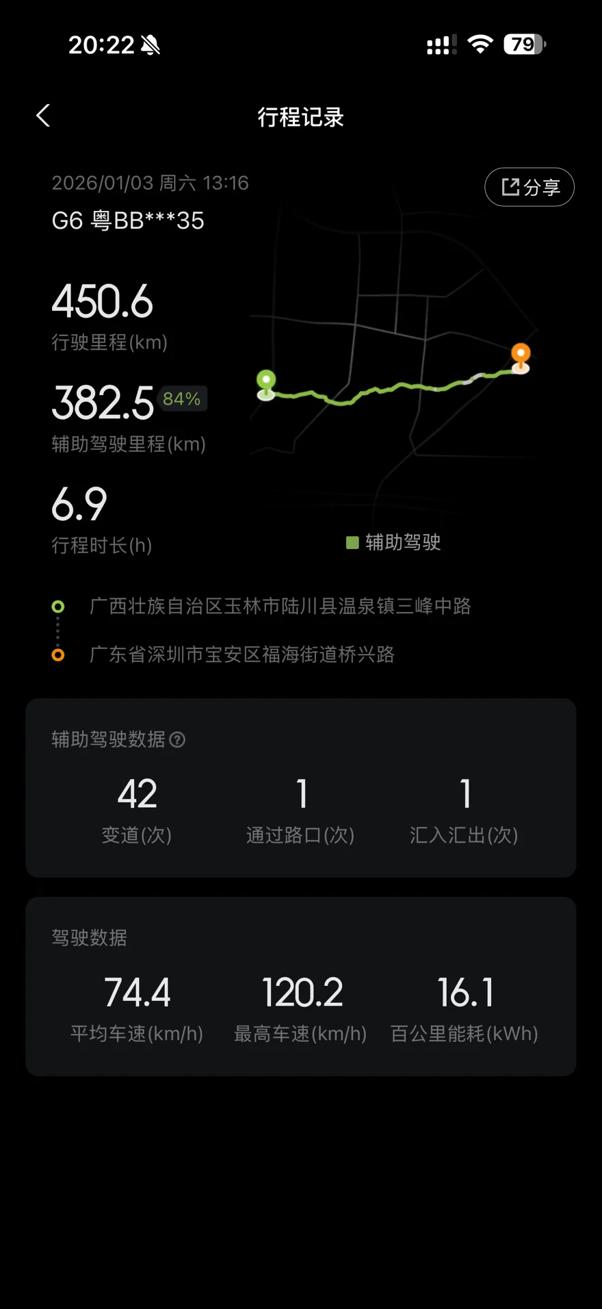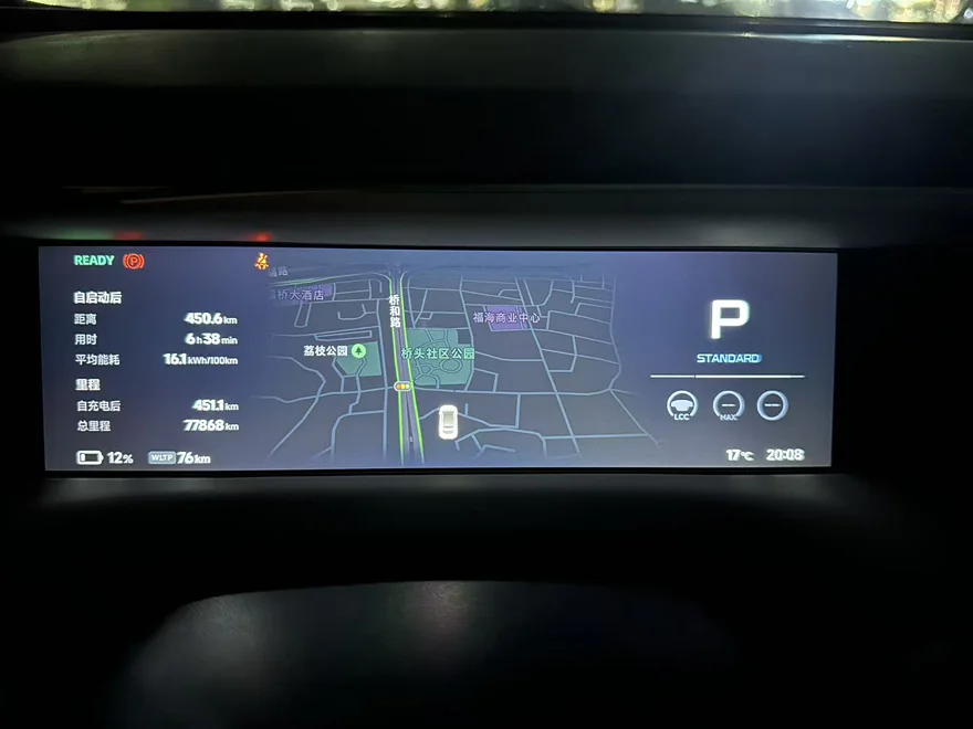 到了晚上8点零8分到达目的地。G6的仪表盘上显示,行驶了450.6公里,用了6小时38分,比原来导航预估时间多了1小时,主要原因还是元旦期间车流量大。而WLTP续航居然还剩余12%,76公里。出发前是614公里,所以一共消耗WLTP的538公里续航WLTP续航达成率是83.8%。这续航达成率还是挺满意的,毕竟是满载5人的情况下。